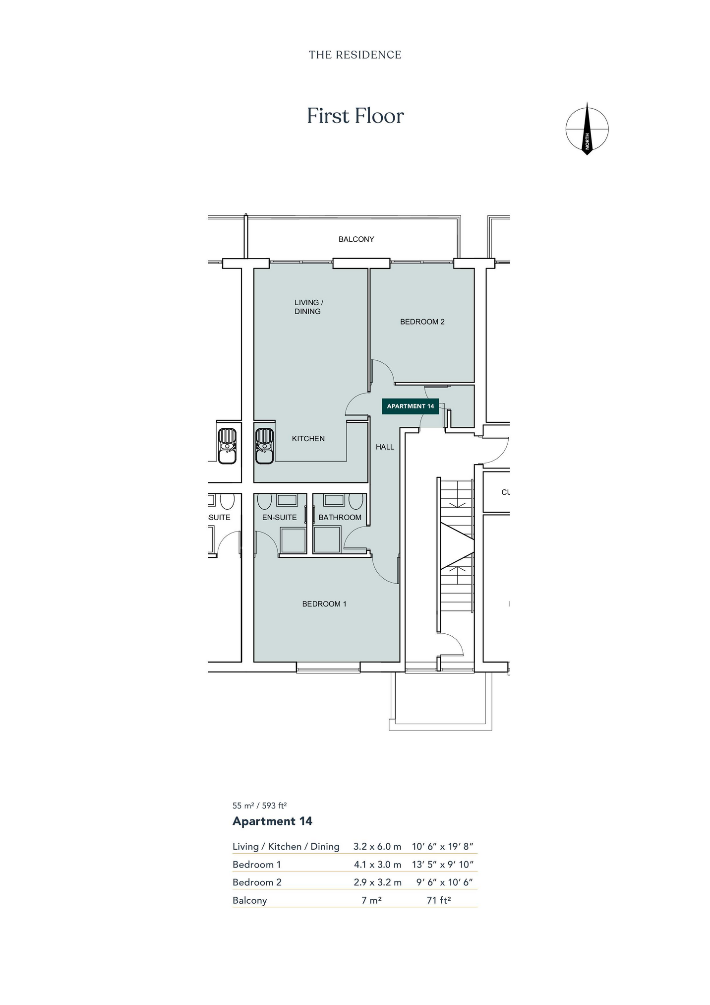 Apartment 14, a first-floor apartment featuring an open-plan living room, kitchen, and dining area. This apartment includes a double bedroom with an en-suite shower room, a second double bedroom, a separate bathroom, and balcony overlooking South Road recreation field.