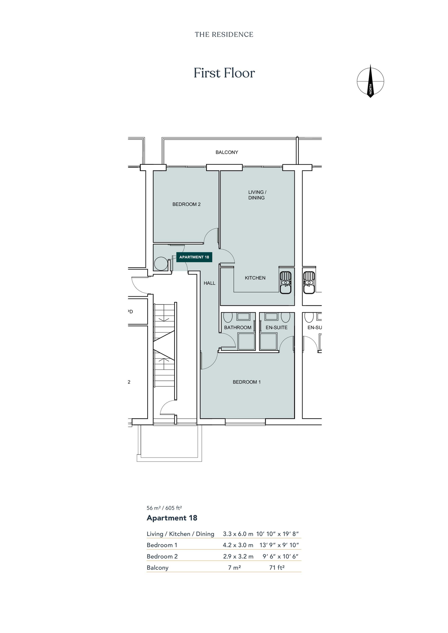 Apartment 18, a first-floor apartment featuring an open-plan living room, kitchen, and dining area. This apartment includes a double bedroom with an en-suite shower room, a second double bedroom, a separate bathroom, and balcony overlooking South Road recreation field.