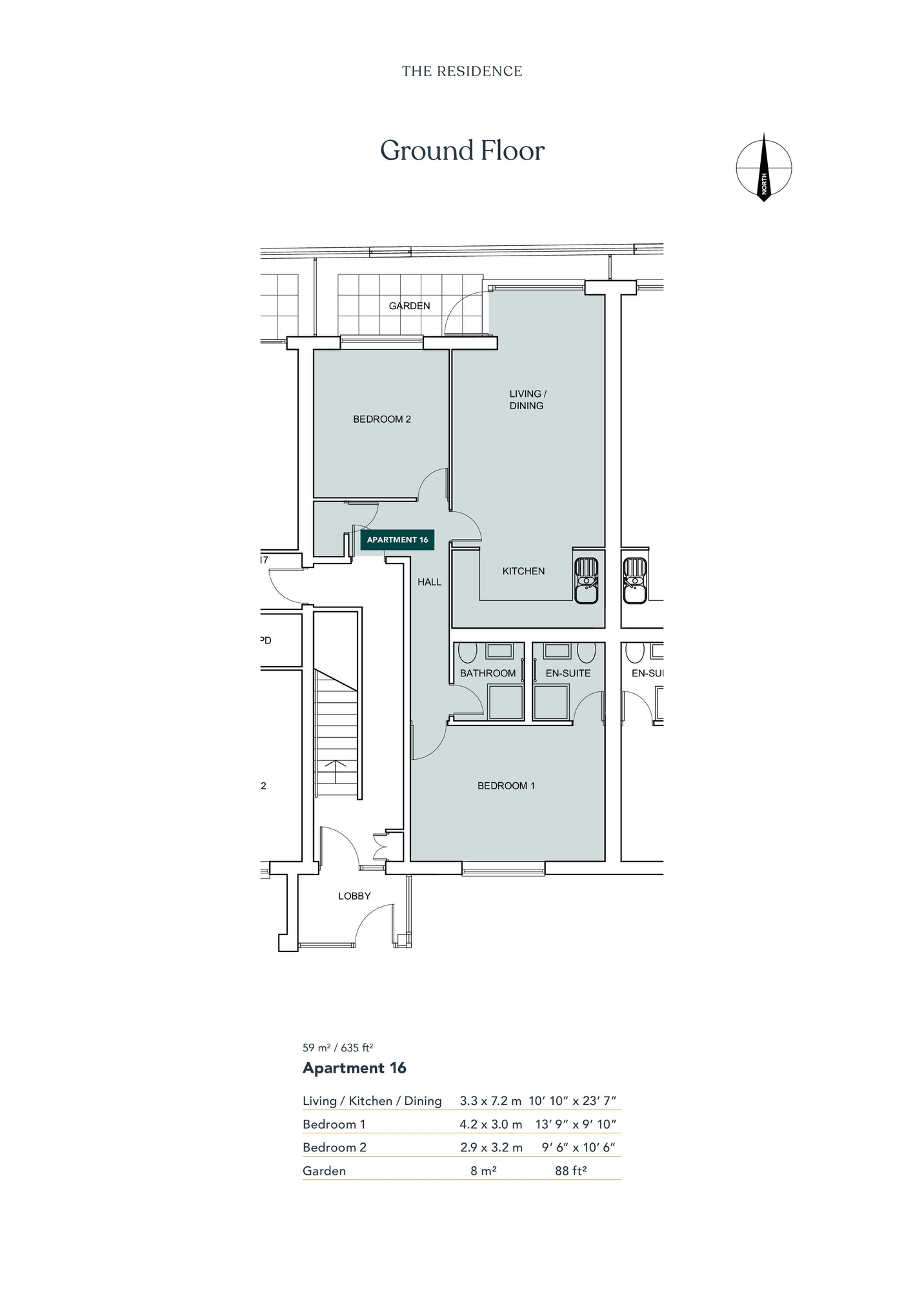 Apartment 16 a ground floor apartment featuring an open-plan living room, kitchen, and dining area. This apartment includes a double bedroom with an en-suite shower room, a second double bedroom, a separate bathroom, and terrace overlooking South Road recreation field.