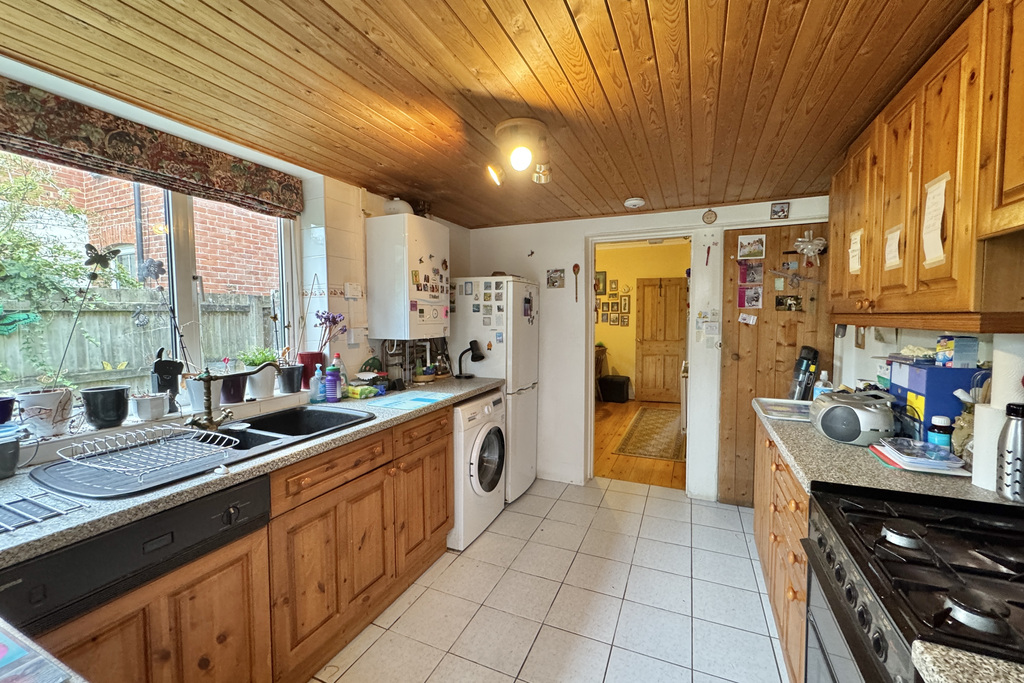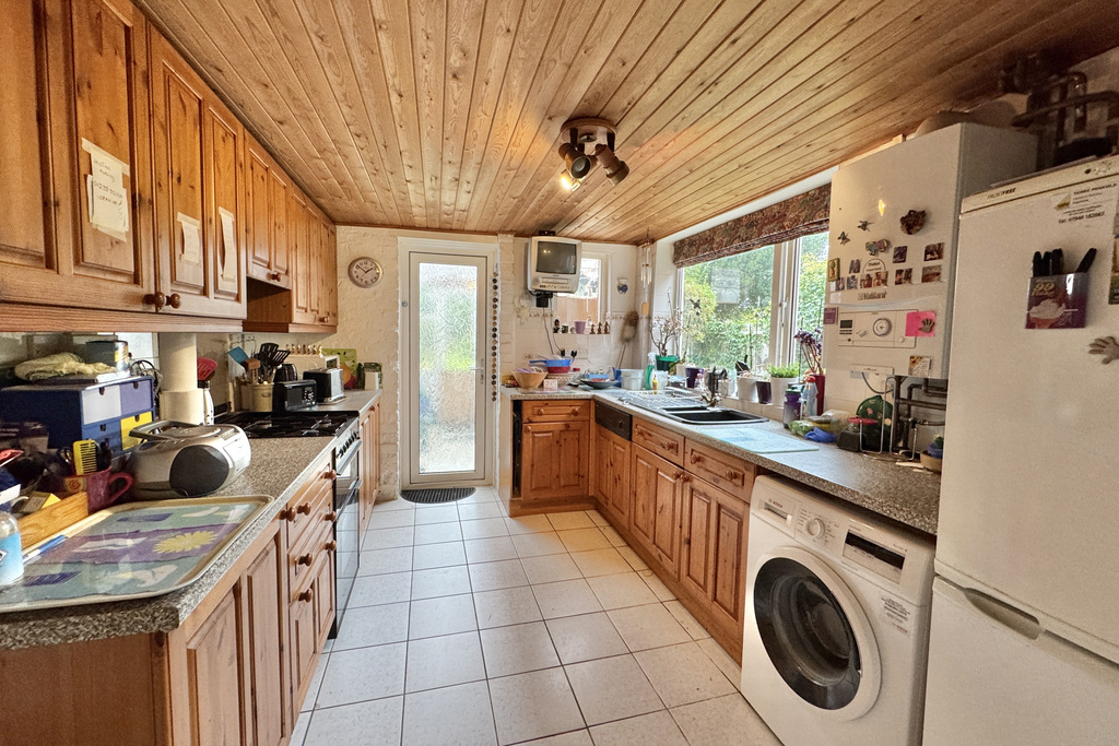 with tiled flooring, a selection of high and low level kitchen cabinets, laminate worktops, freestanding fridge/freezer, freestanding washing machine, wall mounted Vaillant gas fired boiler, one and a half bowl composite sink, uPVC double glazed window to side, uPVC double glazed window to conservatory, freestanding gas oven with four ring hob over, extractor fan, localised tiling, radiator, understairs cupboard, uPVC double glazed door leading to