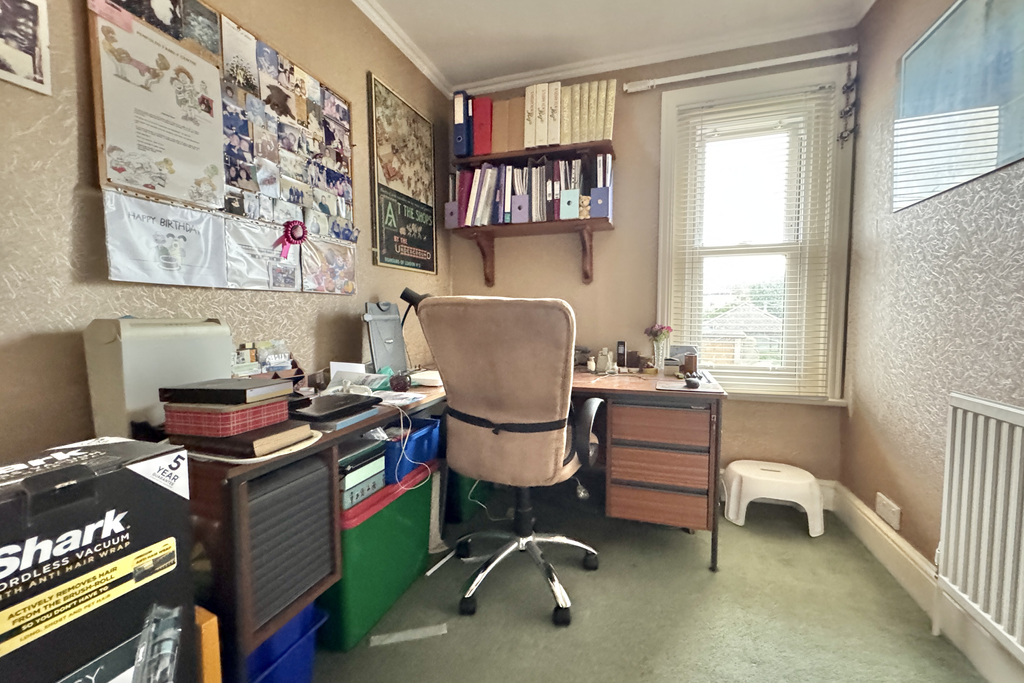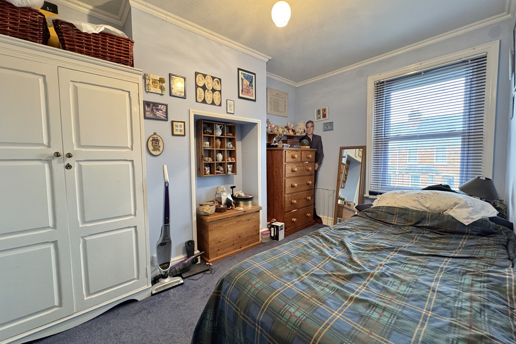 with uPVC double glazed sash window overlooking front, radiator, freestanding wardrobe with hanging rail and shelving over