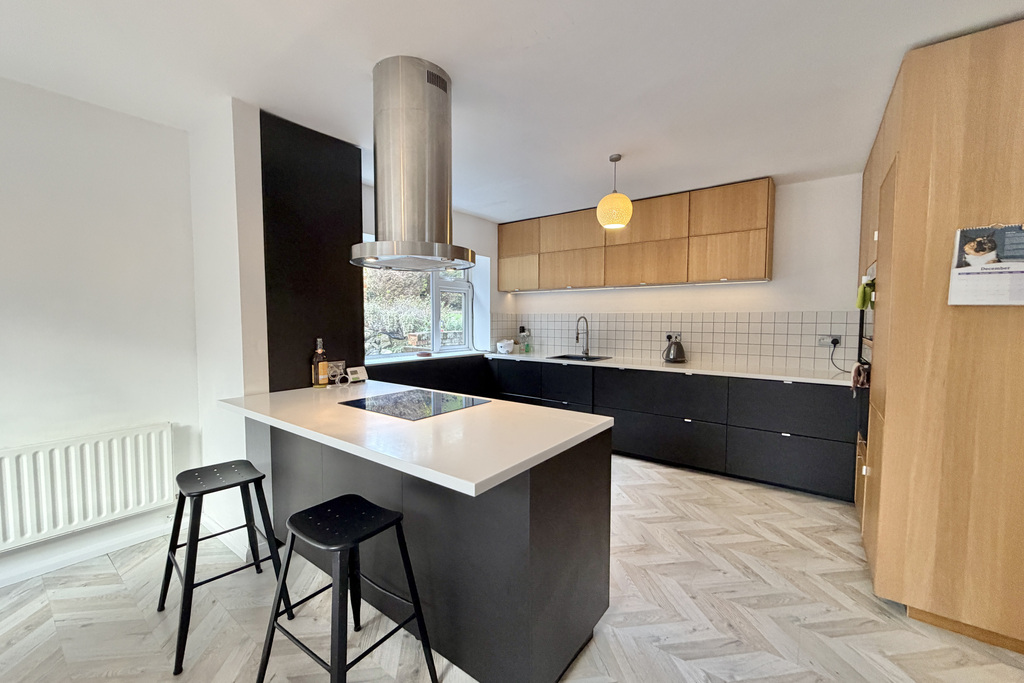 with wood effect laminate flooring enjoying underfloor heating, uPVC double glazed sliding doors to side, radiator, a selection of high and low level modern kitchen cabinets, quartz worktops, four ring induction hob with extractor fan over, localised tiling, integrated washing machine, one bowl composite sink, uPVC double glazed windows overlooking rear, integrated dishwasher, integrated Bosch microwave oven, integrated Bosch fan assisted, integrated fridge, integrated freezer