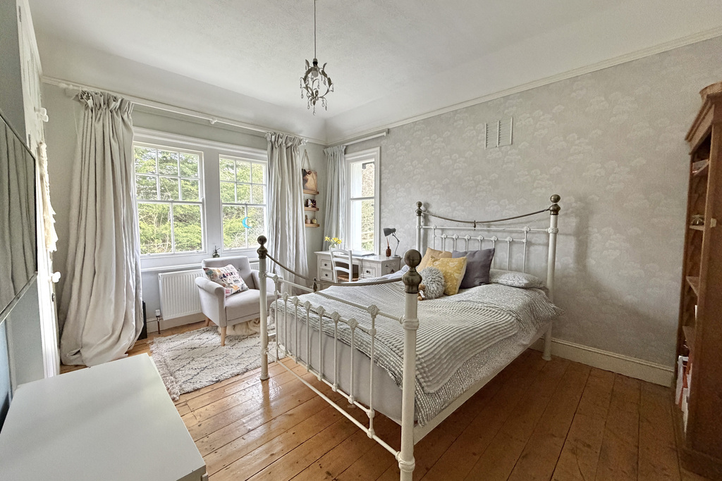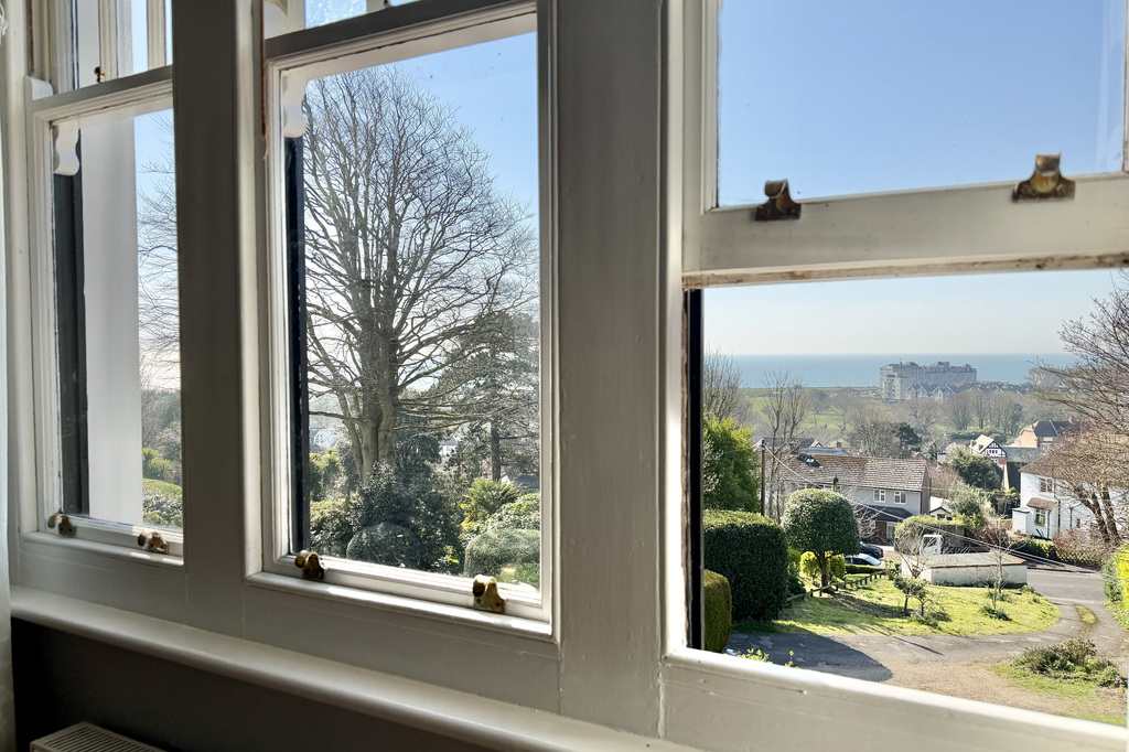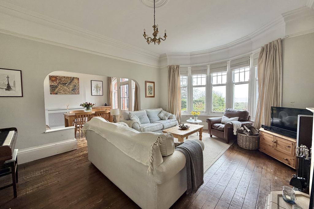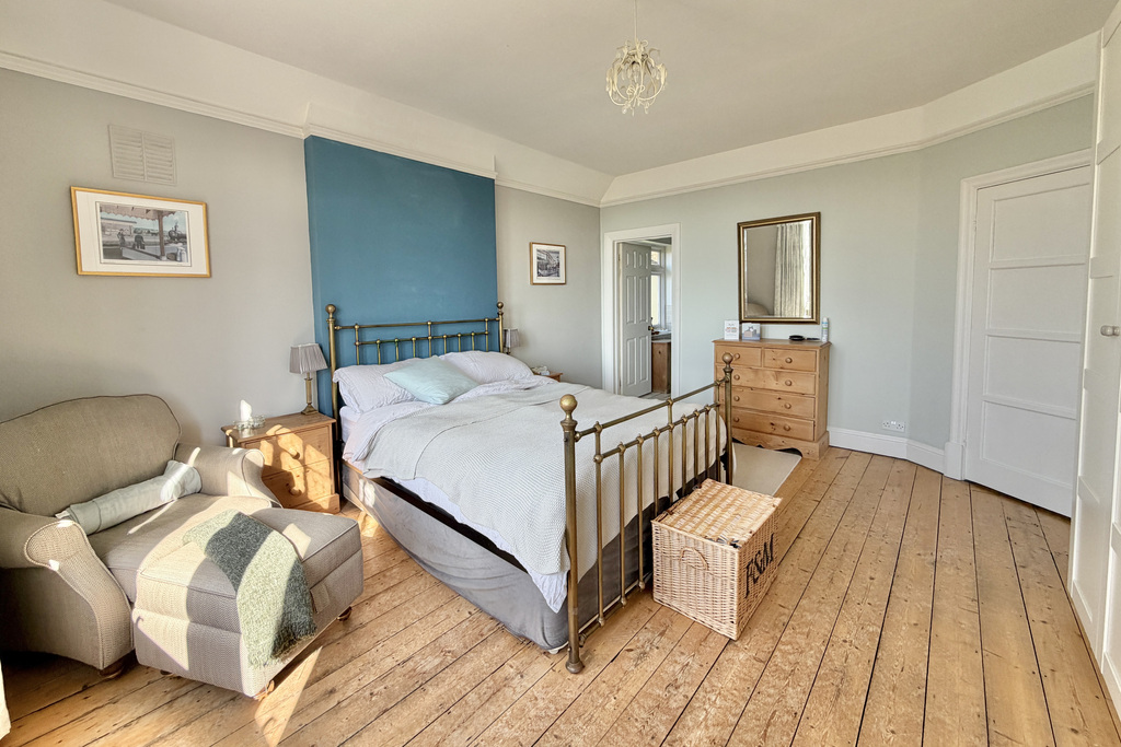 with restored wooden floorboards, glazed sash windows overlooking front with panoramic sea views, radiator