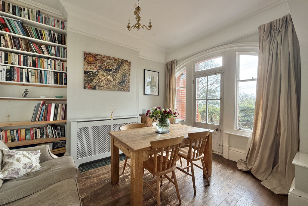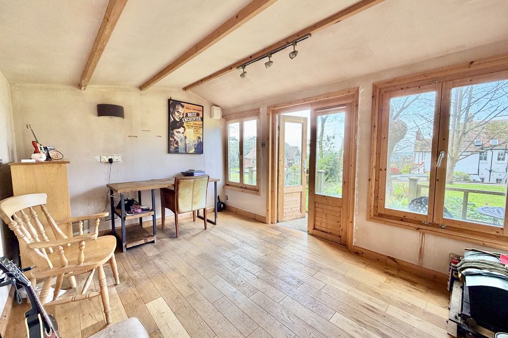 with restored wooden floorboards, glazed sash windows with glazed door to middle leading to outside veranda enjoying stunning views over Hythe town to sea, alcove shelving, radiator