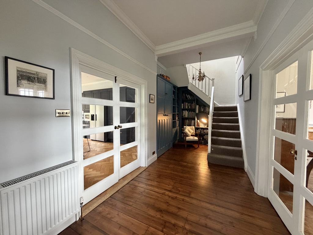 with stained glass solid wood front door, a mixture mosaic tiled flooring & restored wooden floorboards, radiator, reading nook with built in storage cupboards and shelving, understairs storage, wooden double glazed sash window to side