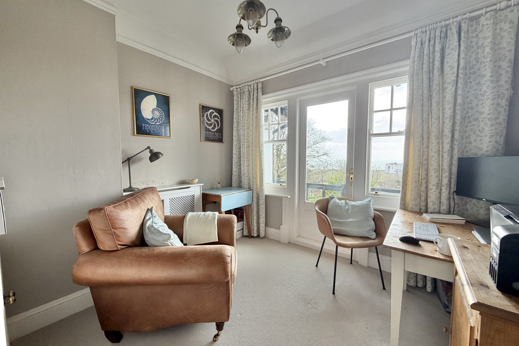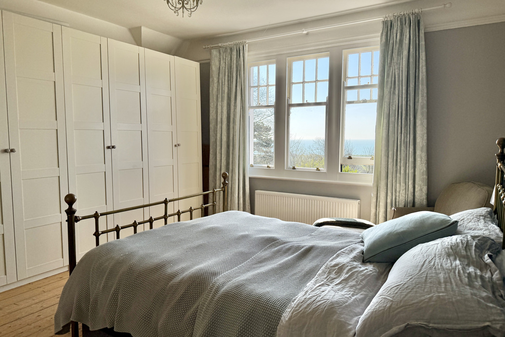 with glazed sash windows with door to middle leading to a small balcony enjoying beautiful views to sea, radiator, fitted cabinets with shelving & storage under