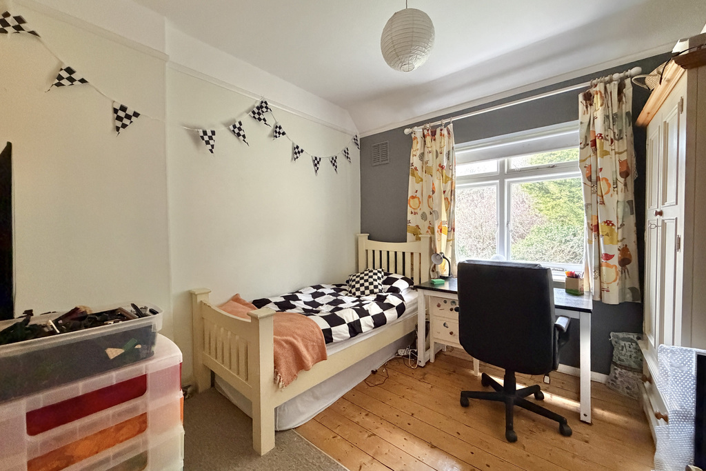 with glazed sash window to side and sealed window to rear, radiator, built in wardrobes with hanging rail & shelving over