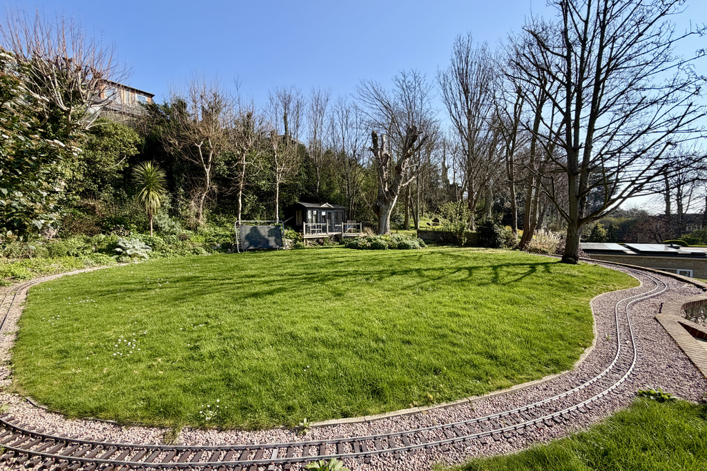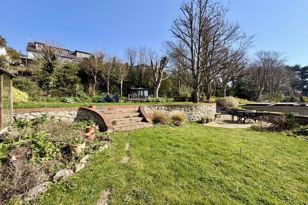 The beautifully landscaped rear garden is thoughtfully arranged, designed to make the most of the stunning sea views. A generous outside seating area extends directly from the kitchen, providing an ideal space for outdoor dining and entertaining, with access to a brick shed. Steps rise to a further area predominantly laid to lawn and including a greenhouse, complemented by an additional patio terrace perfectly positioned for outside sofas and dining to enjoy the sea view. A final set of steps leads to the final area which is mainly laid to lawn with well-stocked planted borders and the garden room/ office, all enjoying far-reaching coastal views. A side pathway leads to the front garden, which also benefits from a veranda and lawn with established planting, again taking full advantage of the elevated position. The property further offers hardstanding for multiple vehicles via a shared driveway, along with a detached garage located at the lower level.