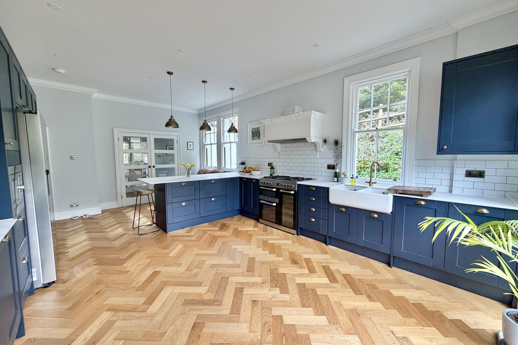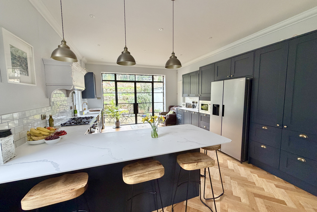 with herringbone flooring, a selection of high and low level modern shaker style cabinets, localised tiling, multiple sockets, glazed sash windows to side, stone effect compacted laminate worktops, breakfast bar (with USB charging sockets below), space for freestanding range gas oven and Bosch extractor fan, inset two bowl ceramic butler sink with mixer tap over, integrated slimline dishwasher, Worcester Bosch boiler concealed within kitchen cabinet, feature powder coated double glazed doors leading out to rear garden, hot drinks area including one bowl stainless steel sink, tall modern radiator, integrated microwave, space for freestanding American fridge freezer