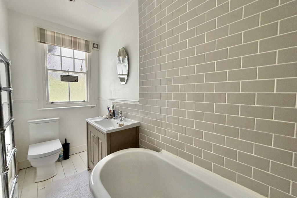 with painted floorboards, WC, frosted sash widow, hand basin with mixer tap over and modern storage cabinet under, towel radiator, roll top bath with mixer tap over and separate hand shower attachment and rainfall shower over, localised metro tiling