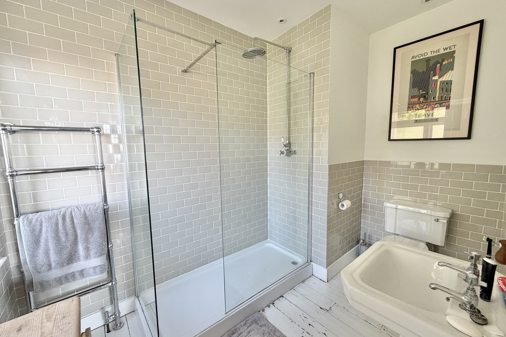 with painted floorboards, localised modern metro tiling, glazed frosted window to side, WC, towel radiator, hand basin with hot/cold taps over, walk in shower cubicle with rainfall shower over