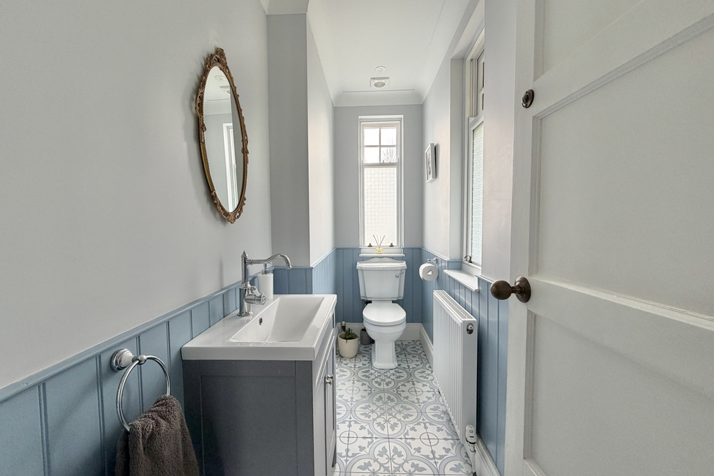 with mosaic tiled flooring, WC, hand basin with mixer tap over and modern storage cabinet under, glazed sash windows, radiator