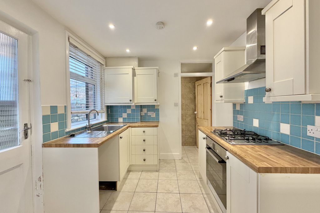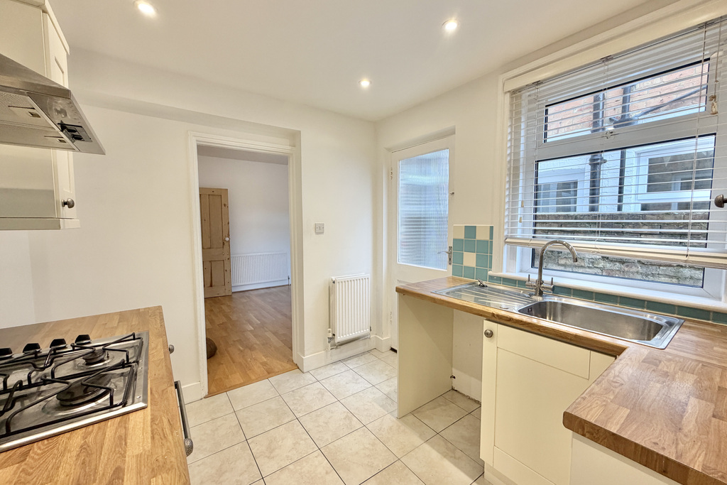 with tiled flooring, a selection of high and low level kitchen cabinets, wood effect laminate worktops, radiator, glazed door leading to rear garden, space and plumbing for washing machine or dishwasher, stainless steel sink with mixer tap over, uPVC double glazed window to side, integrated fan assisted oven, four ring gas hob with extractor fan over