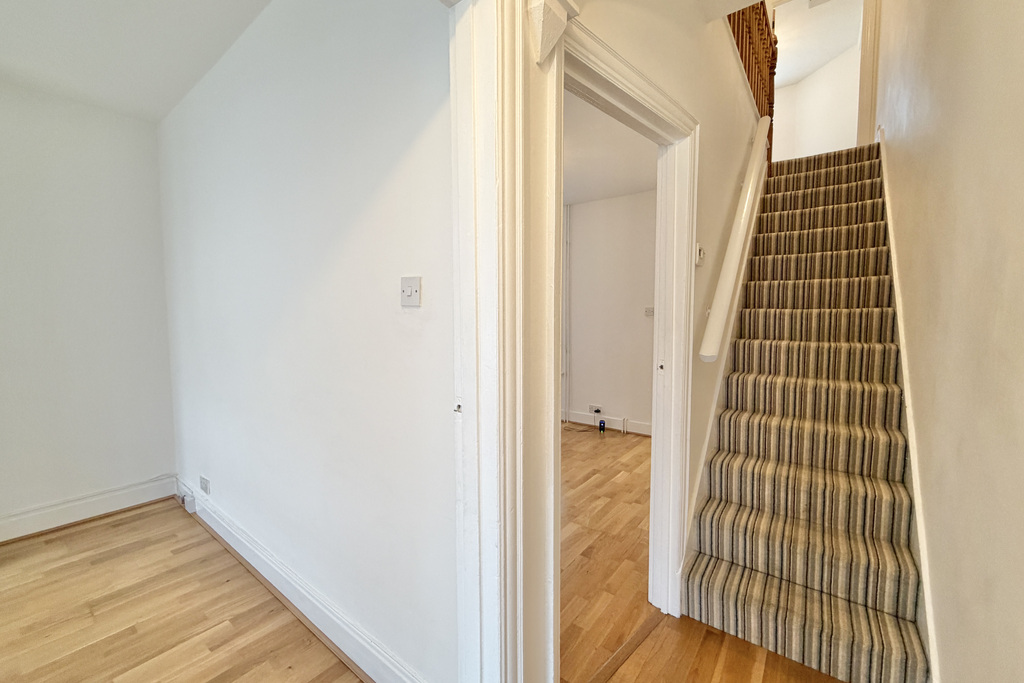 with wood effect laminate flooring, radiator, shelving & cupboard into alcove, uPVC double glazed window overlooking rear, upstairs cupboard with RCD fuse box and meters