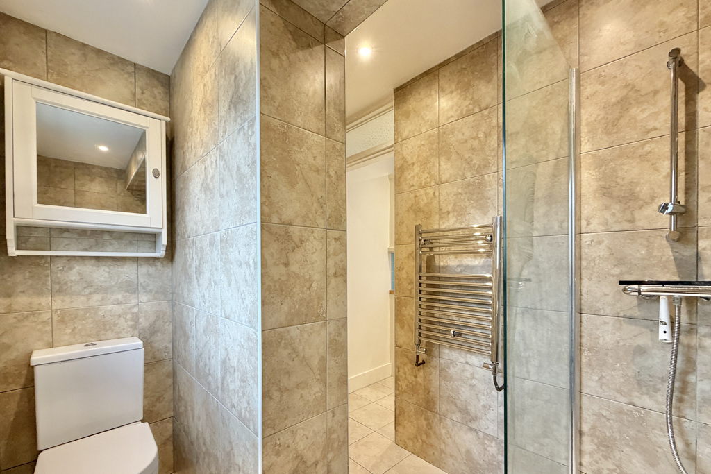 with tiled flooring, WC, uPVC double glazed frosted window, hand basin with mixer tap over, walk in shower cubicle, towel radiator