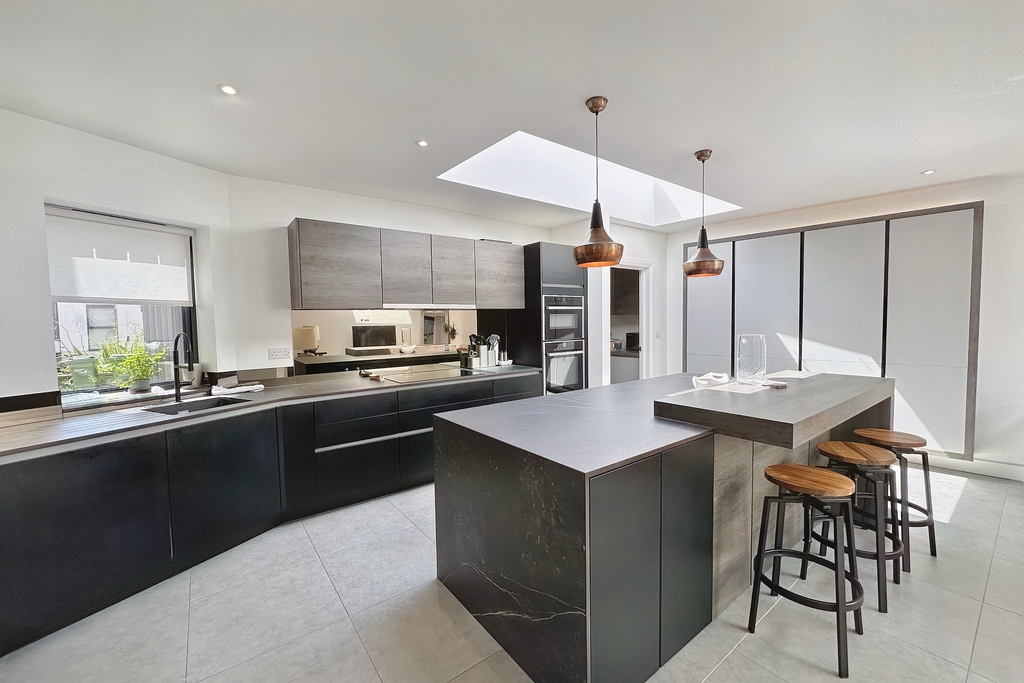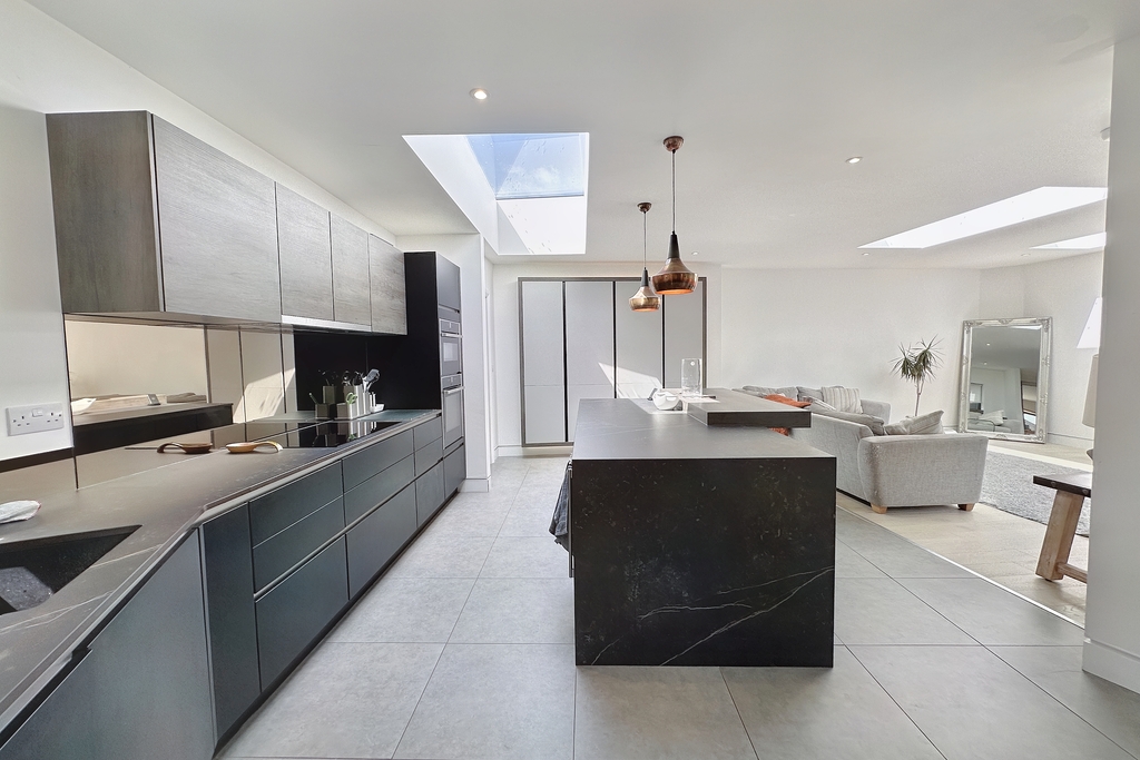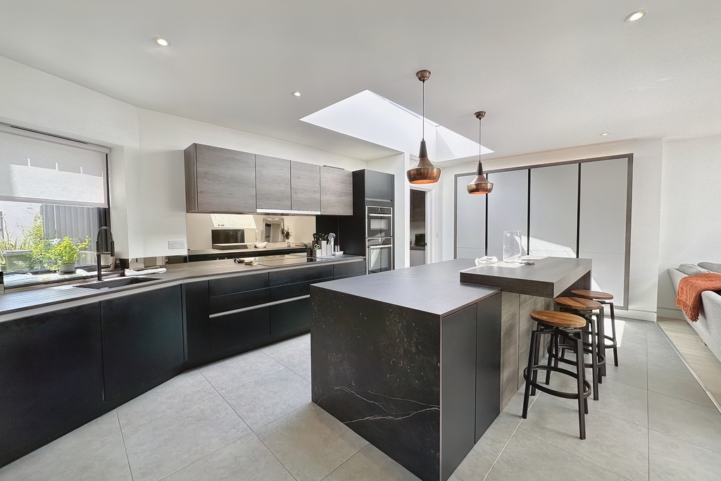 with modern tiled flooring, a selection of high and low level kitchen cabinets, compacted laminate worktops, mirrored glass upstands with matching splashback, inset composite sink with mixer tap over, powder coated double glazed window overlooking side, integrated Neff dishwasher, four ring Neff induction hob with extractor fan over, integrated combination microwave/oven, integrated fan assisted oven, selection of floor to ceiling larder units, integrated fridge, integrated tall freezer, island with selection of cupboards and Dekton ceramic marble effect worktops, integrated wine fridge, breakfast bar, skylight