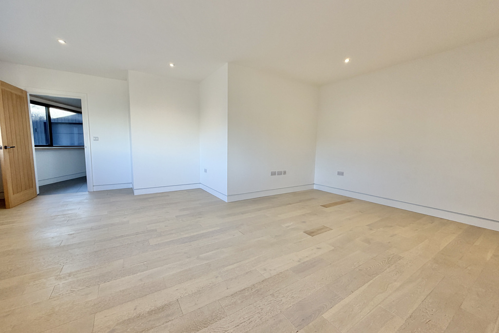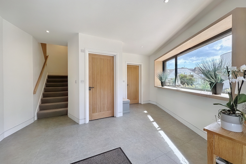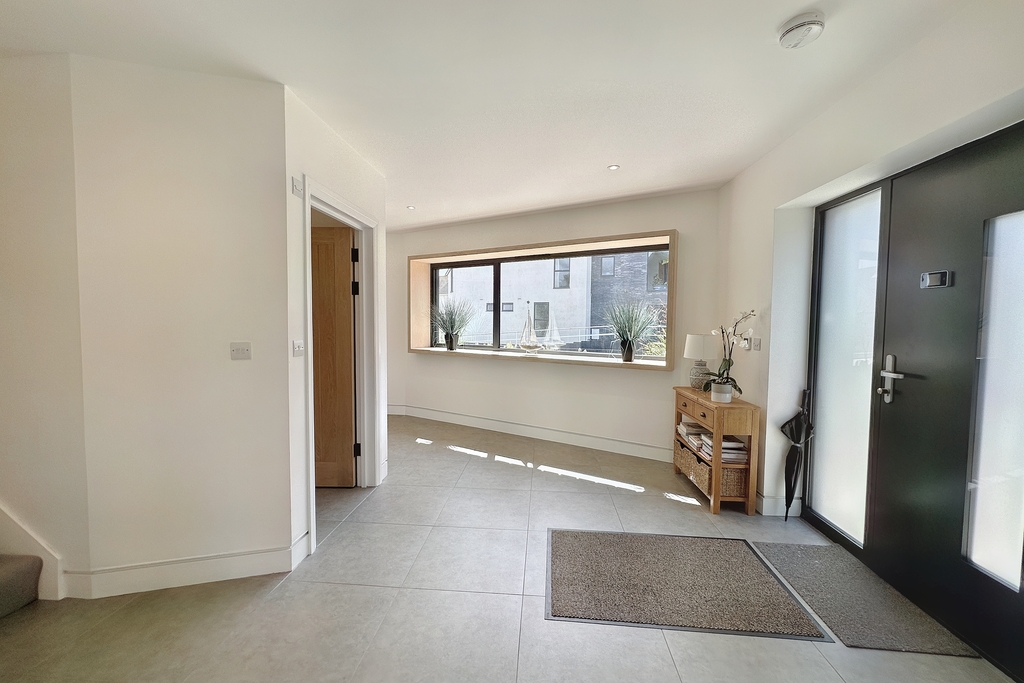 with engineered wood flooring, floor to ceiling powder coated double glazed windows overlooking rear garden, large understairs storage cupboard with RCD fusebox and underfloor heating manifold