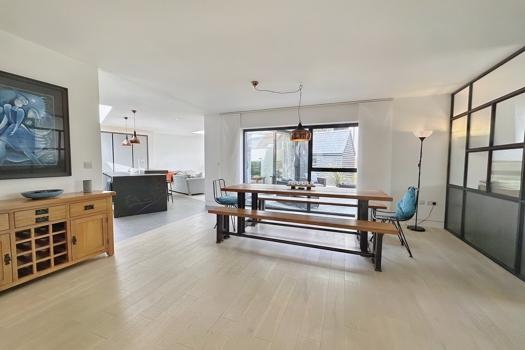 with industrial style room dividing wall with glazed sections, engineered wood flooring, powder coated double glazed windows overlooking rear garden, powder coated double glazed sliding doors overlooking rear garden