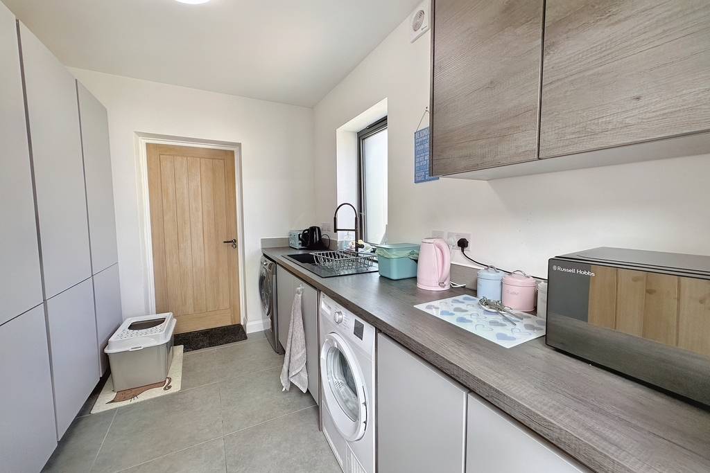 with modern tiled flooring, a selection of high and low level cabinets, laminate worktops with tiled up stands, space and plumbing for separate washing machine and tumble dryer, frosted powder coated double glazed window, floor to ceiling units housing gas fired boiler and pressurised hot water cylinder