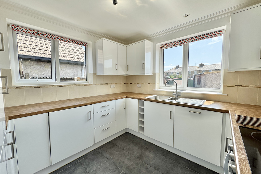 with tiled flooring, a selection of high and low level modern kitchen cabinets, wood effect laminate worktops, localised tiling, integrated fan assisted oven, four ring hob with extractor fan over, acrylic splash back, integrated dishwasher, one and a half bowl stainless steel sink with mixer tap over, uPVC double glazed window overlooking side and rear, new integrated fridge freezer, wall mounted gas fired boiler housed within kitchen cabinet, new integrated washing machine, radiator