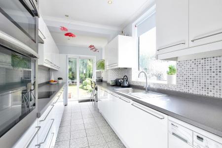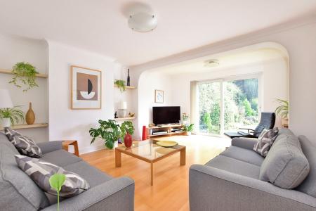 This property offers off street parking for multiple cars and side access into the rear garden. The front porch leads into a bright, airy spacious entrance hall which provides access to two large living rooms and kitchen. The kitchen offers modern fitted units both at base and eye level. There is also built in double oven, microwave, dishwasher and washing machine as well as a larder. The family room is a spacious room with large bay window allowing for natural light to flood in. The living room to the rear has been extended and offer room for multiple sofas, units and tables and offers a delightful view of the garden through sliding doors to the rear. There is also an additional storage cupboard as you enter the house.
