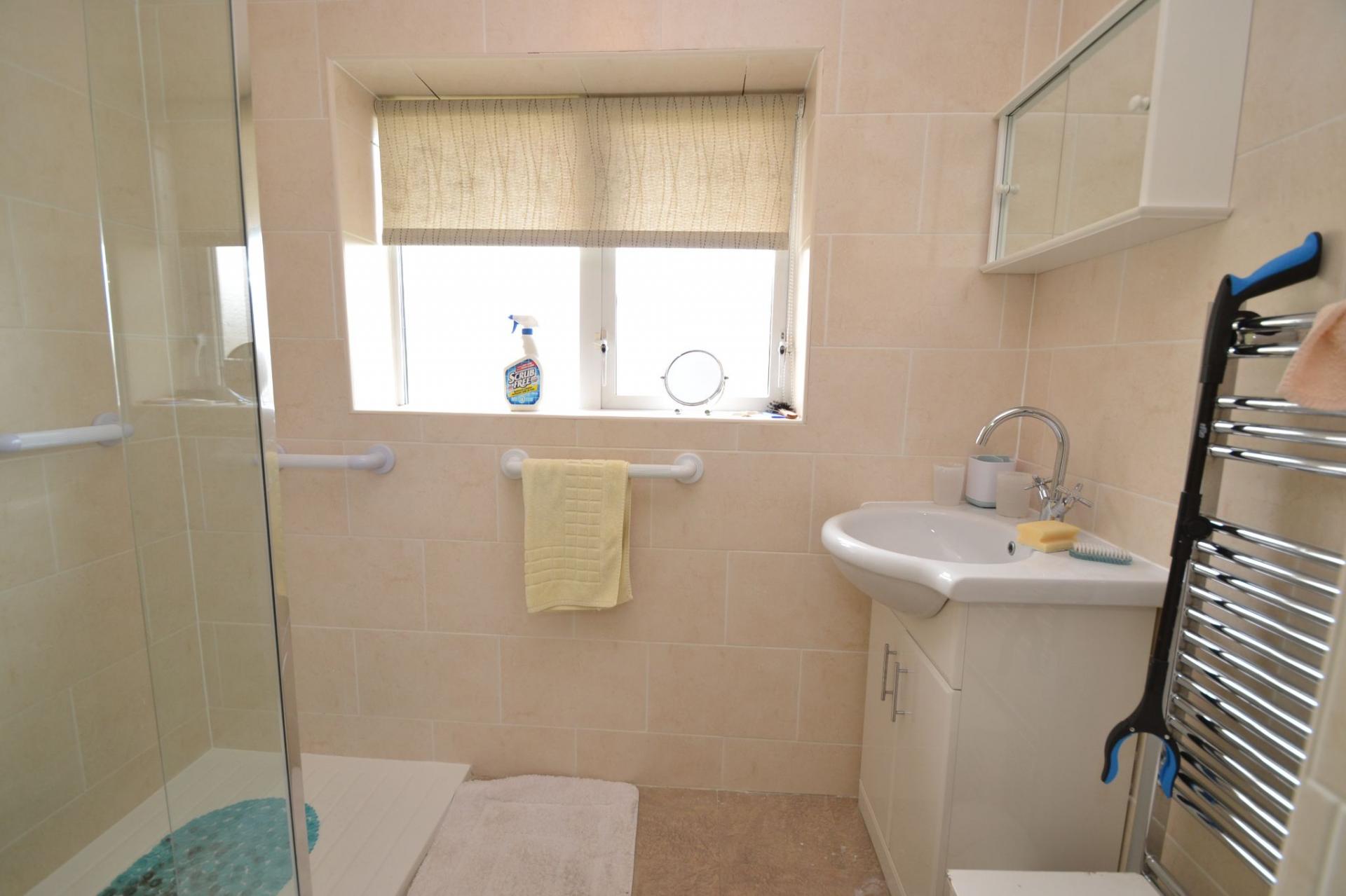 Shower Room: Fully tiled, walk in shower cubicle with a glass screen, electric shower unit, wash basin set on a high gloss vanity unit, heated chrome towel rail, frosted Upvc dg window.