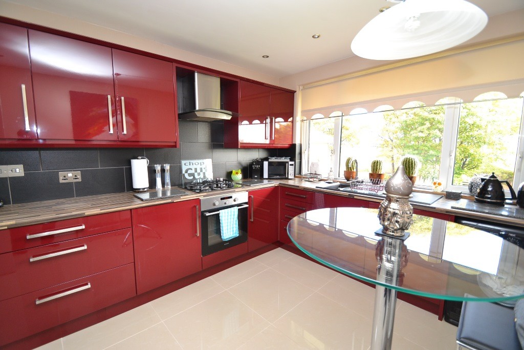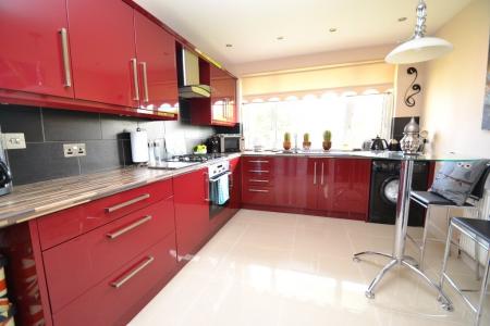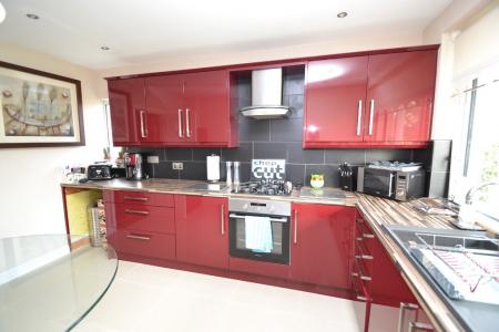 Breakfast Kitchen: 3.89m x 3.01m (12'9 x 9'10). Extensive range of modern wall & base units in high gloss burgandy, walnut effect work tops with under lighting, slate grey tiles above, stainless steel extractor over a 4 ring gas stainless steel hob, built in stainless steel electric oven, plumbed for an auto-washer, space for a tall boy fridge freezer, granite effect 1.5 sink with chrome mixer tap, inset chrome ceiling lights, ch radiator, polished porcelain tiled floor, Upvc dg window to the front, side Upvc dg window, space for a table and chairs.