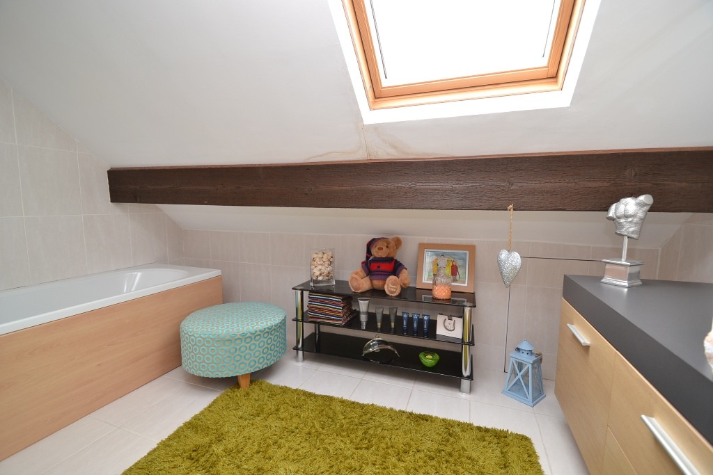 En-Suite: Bath in white with chrome thermostatically controlled unit over the bath, wash basin sat on a contemporary base unit with drawers, inset chrome ceiling lights, dg velux, fully tiled to walls and floor.