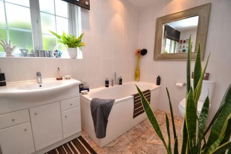 Downstairs Bathroom: 3.00m x 1.74m (9'10 x 5'8). Three piece suite in white, chrome fittings, fully tiled to the walls and floor, frosted Upvc dg window to rear, inset chrome ceiling lights, wash basin in mounted on high gloss vanity unit, heated chrome towel rail.