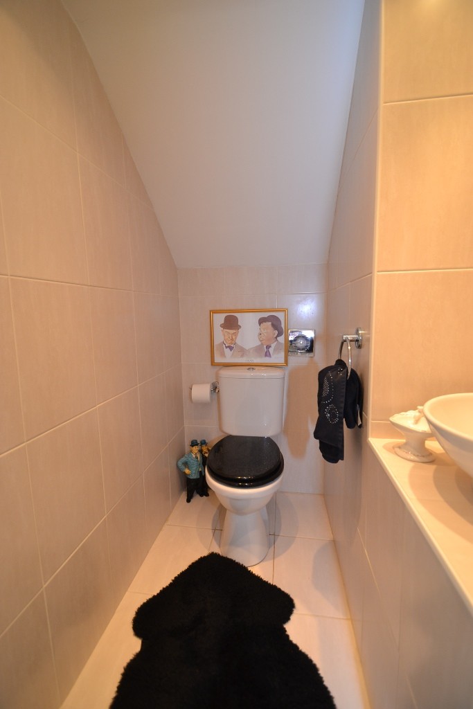 Separate WC: Fully tiled, wc and circular wash basin in white with chrome mixer tap, inset chrome ceiling lights, extractor.