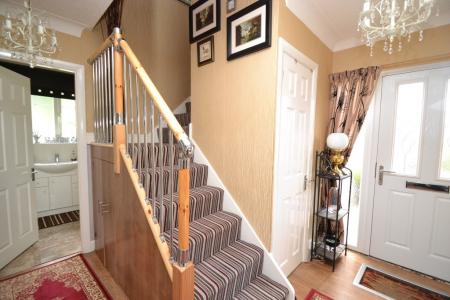 Entrance: Side security composite door into hallway, stairs with modern balustrade, shoe storage cupboard with the Worcester Bosch condensing boiler, additional under stairs storage, ch radiator, laminate floor in oak effect.
