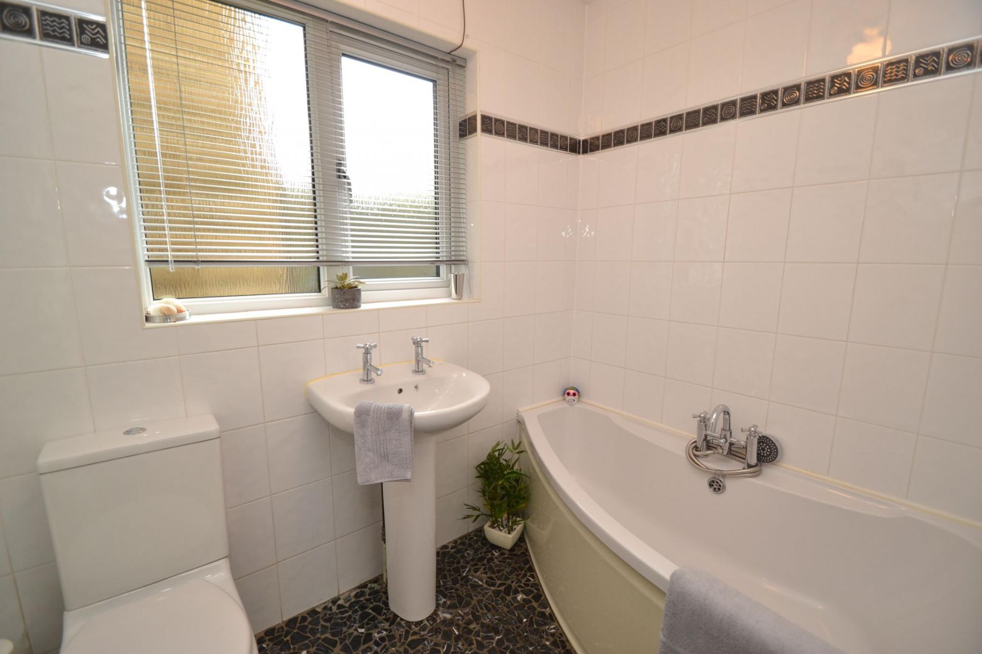 Bathroom: Three piece corner suite in white, chrome fittings, fully tiled, frosted Upvc dg window, radiator.