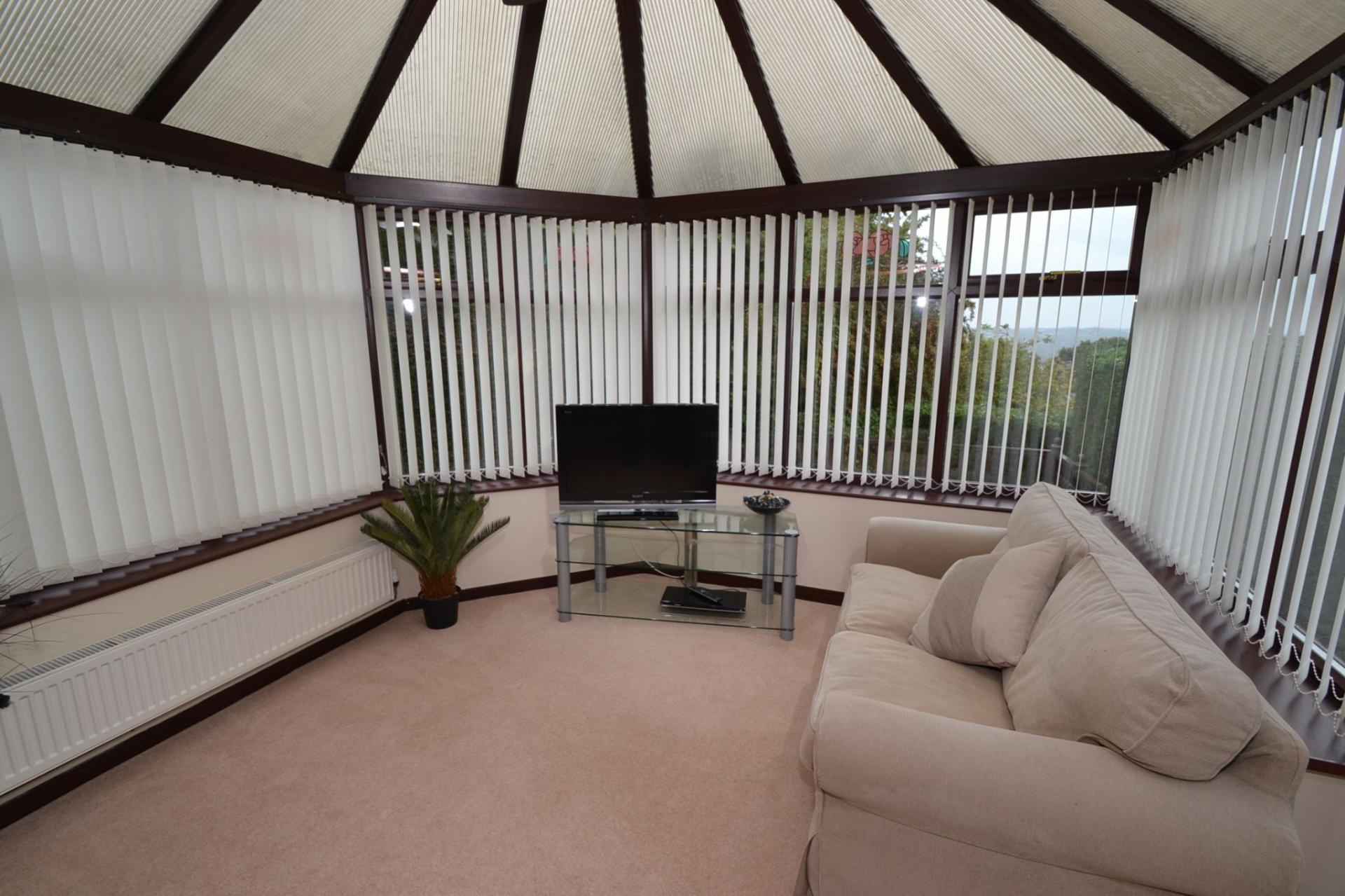 Conservatory: 3.1m x 3.0m (10'4 x 9'8). Pitched roof with ceiling light fan combo, radiator, fitted blinds, side French doors.
