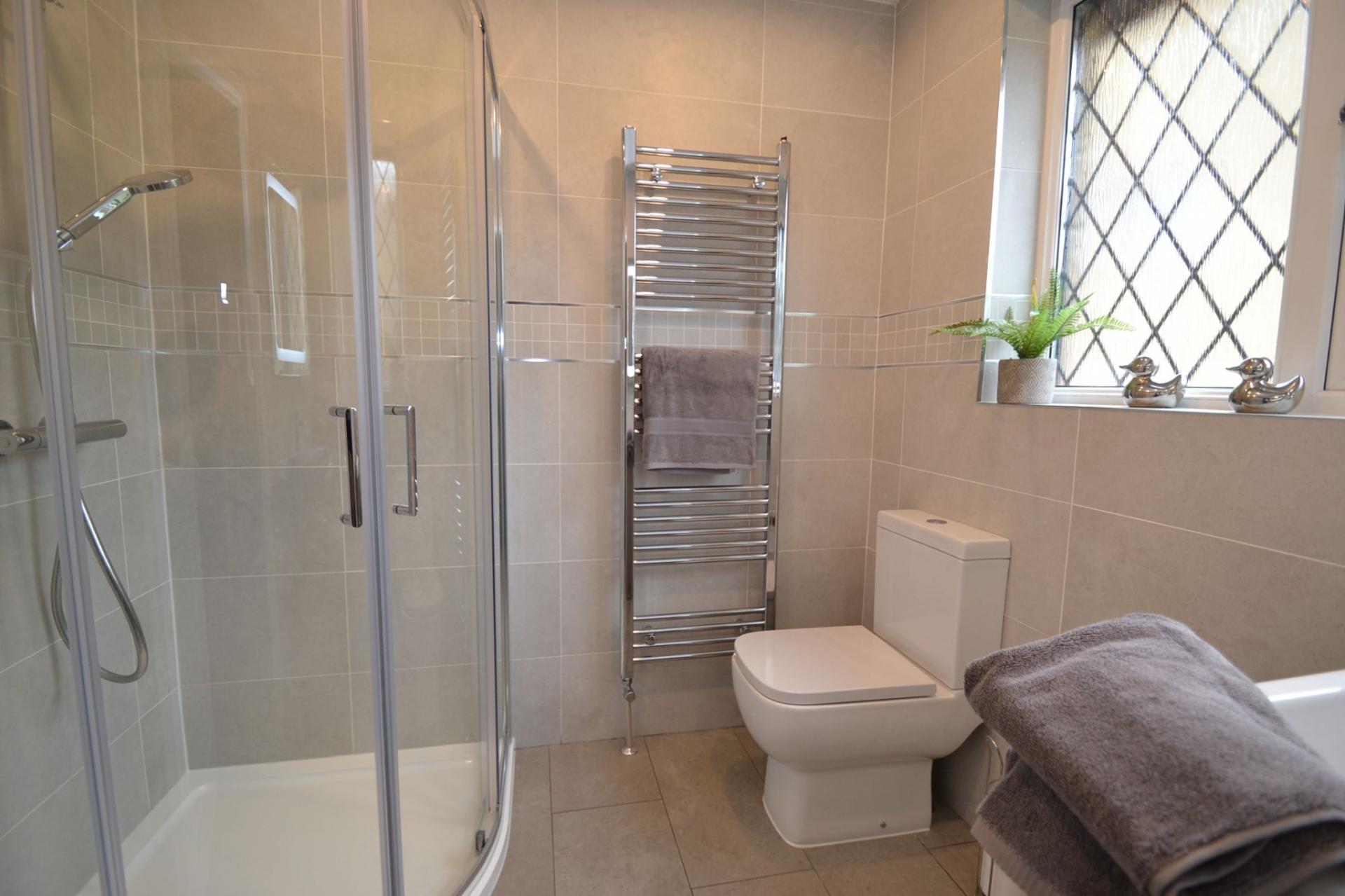 Shower Room: Wrap around modern shower cubicle with a thermostatically controlled shower unit, wash basin set on a base vanity unit, fully tiled, heated chrome towel rail, leaded frosted Upvc dg window, inset ceiling lights.