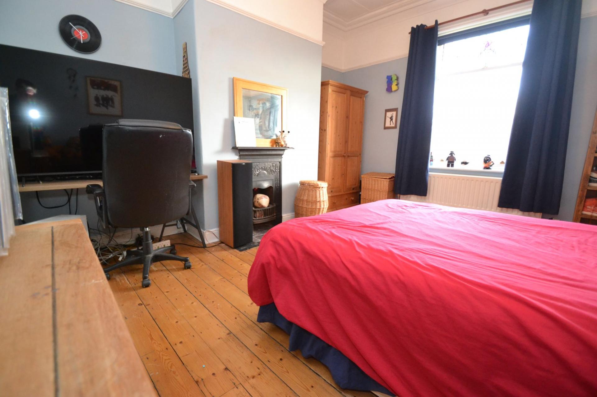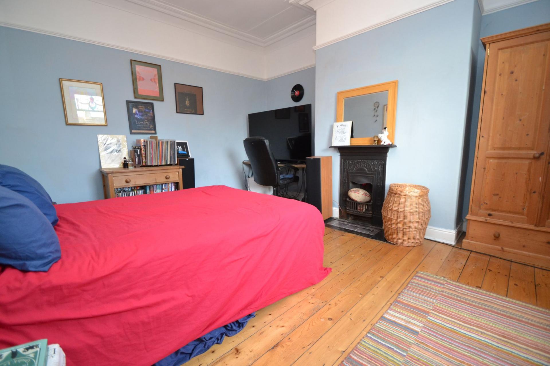 Bedroom 3: 4.52m x 4.01m (14'8 x 13'1). Sash dg wood window with part coloured leaded lights, double radiator, natural wood floor, picture rail, matt black cast iron fireplace feature.