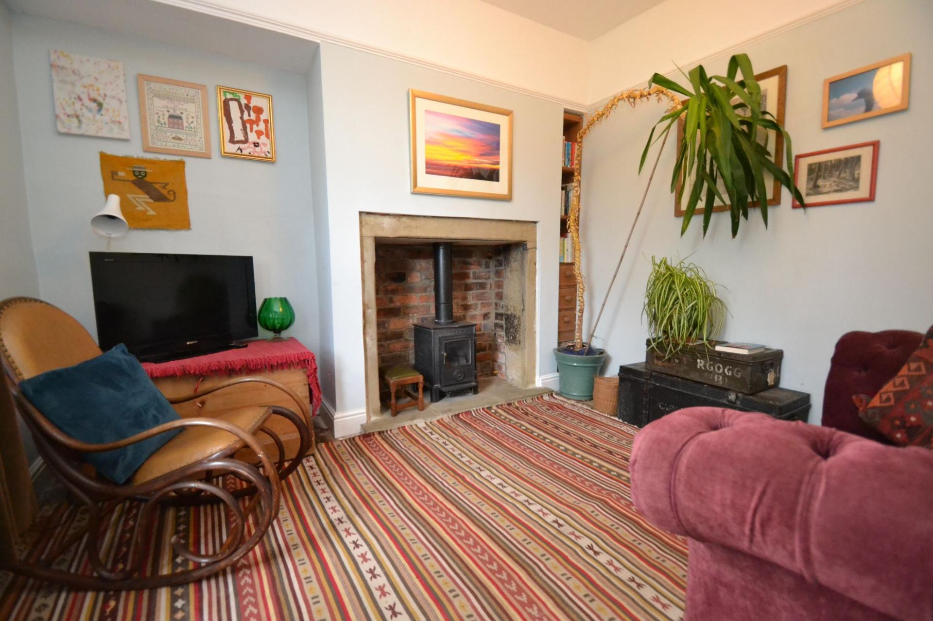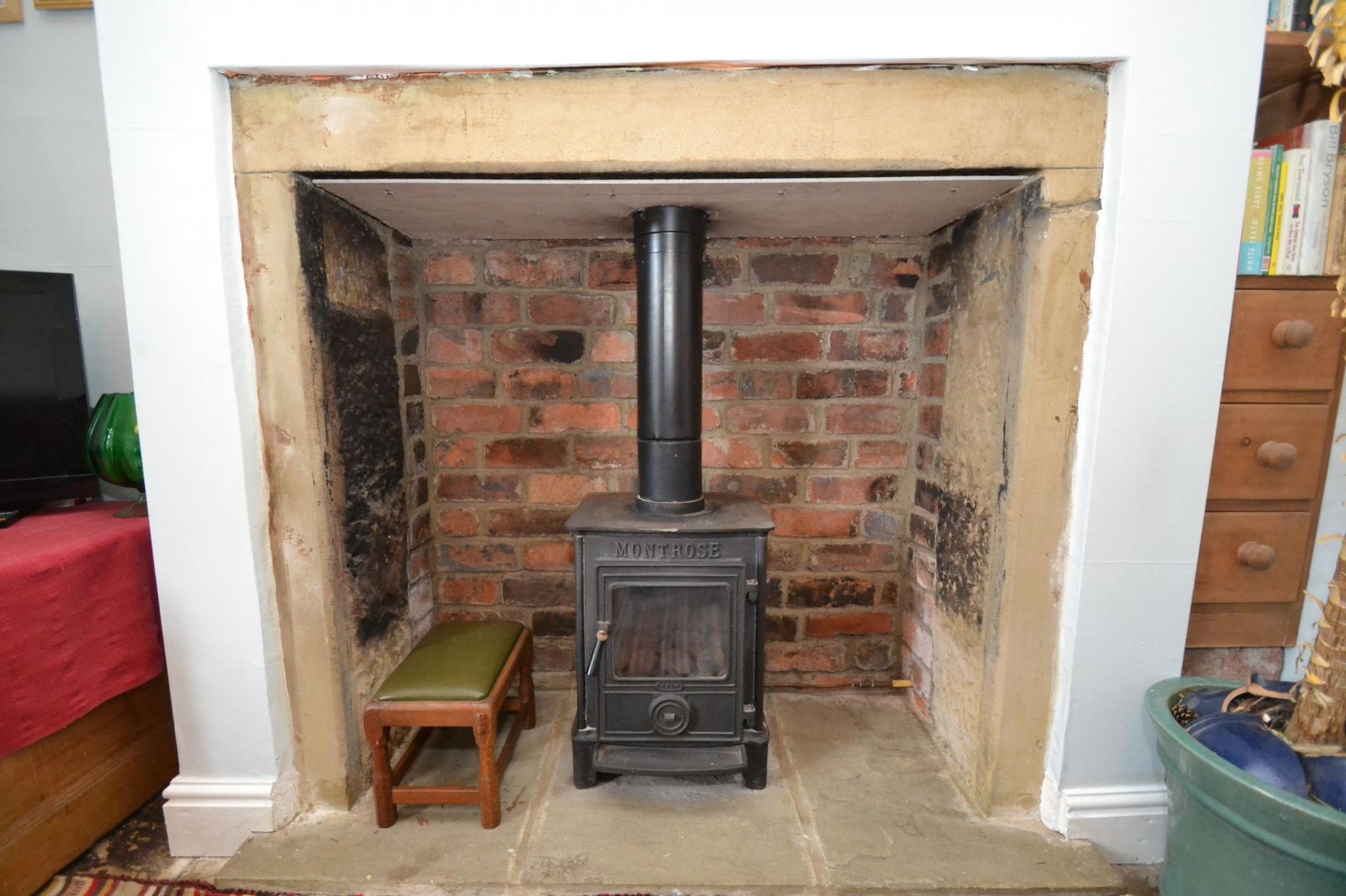 Reception Room 2: 3.44m x 3.44m (11'2 x 11'2). Wood sash dg window with part coloured leaded lights, double radiator under, stone floor, inglenook fireplace with a Montrose gas stove, picture rail.