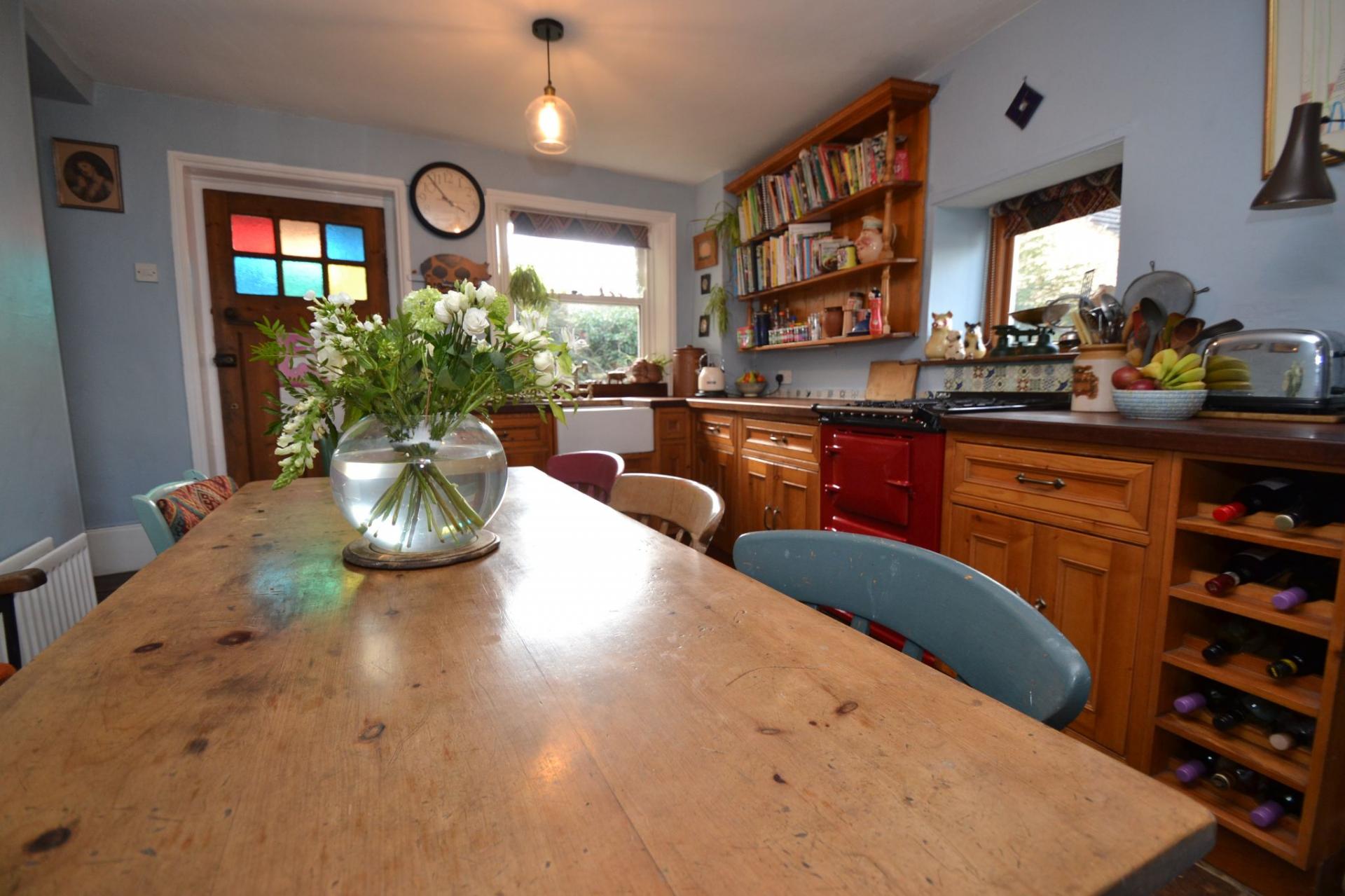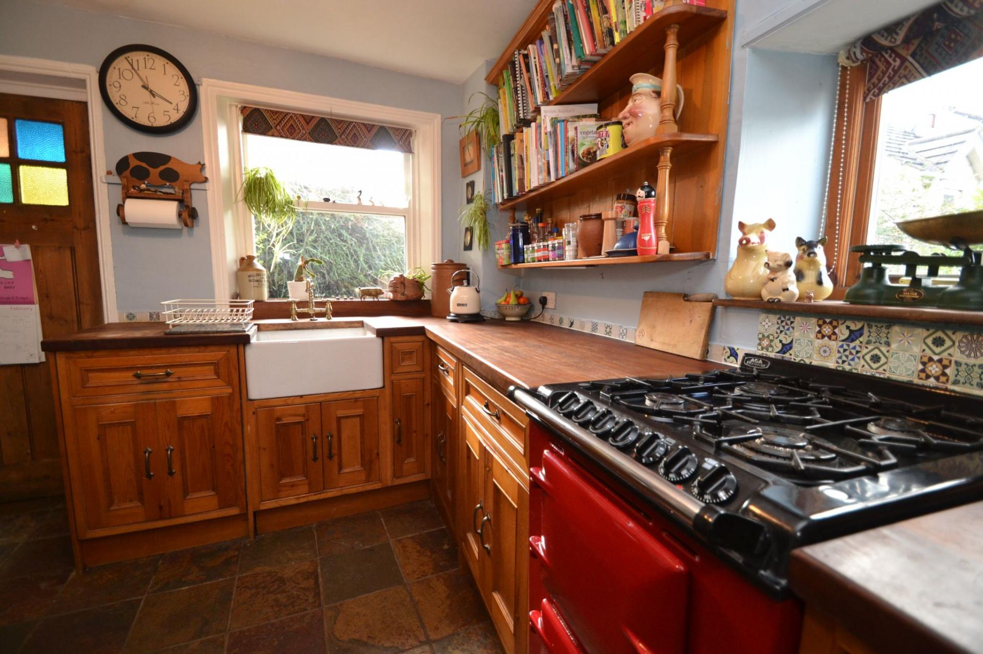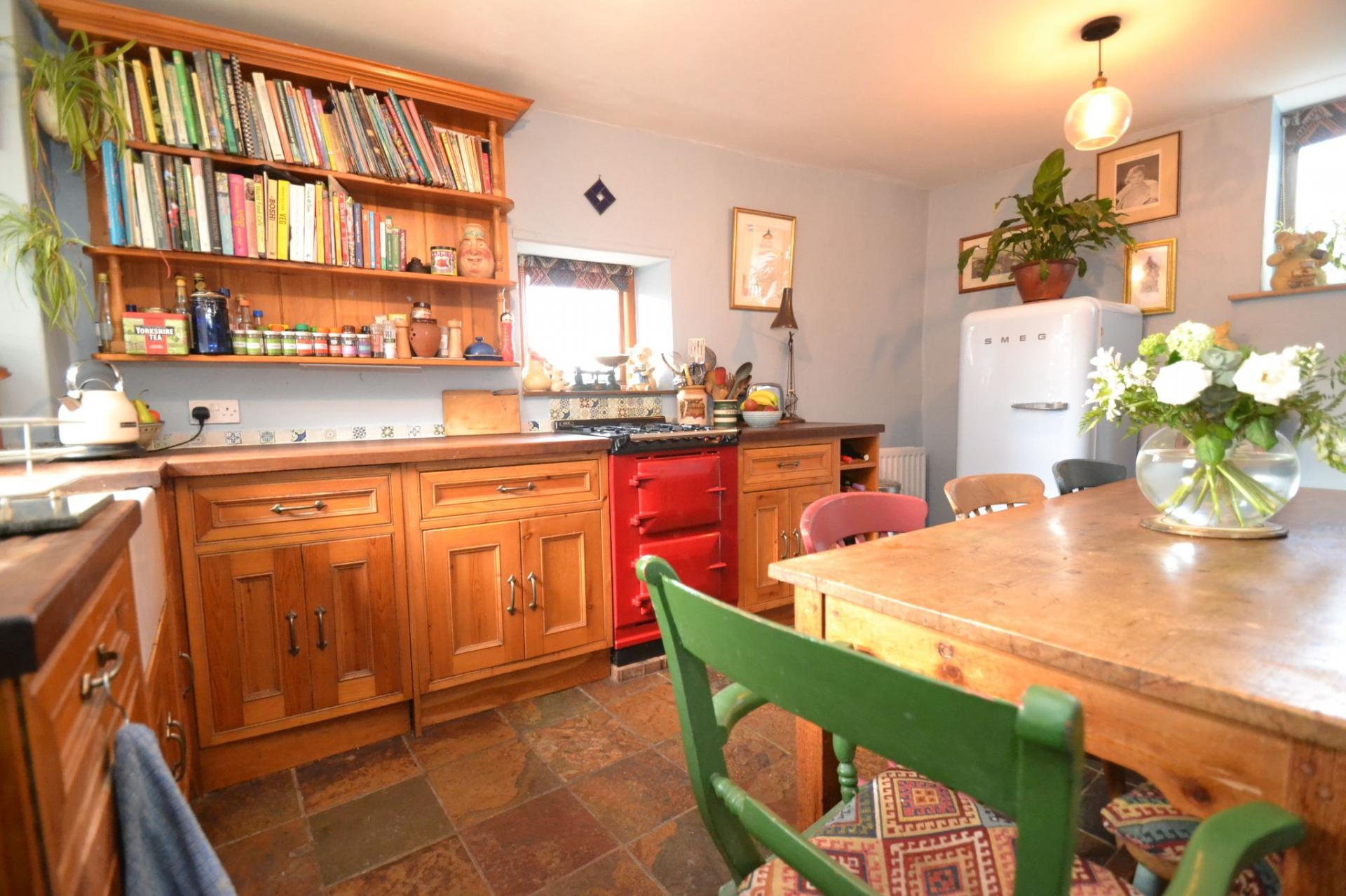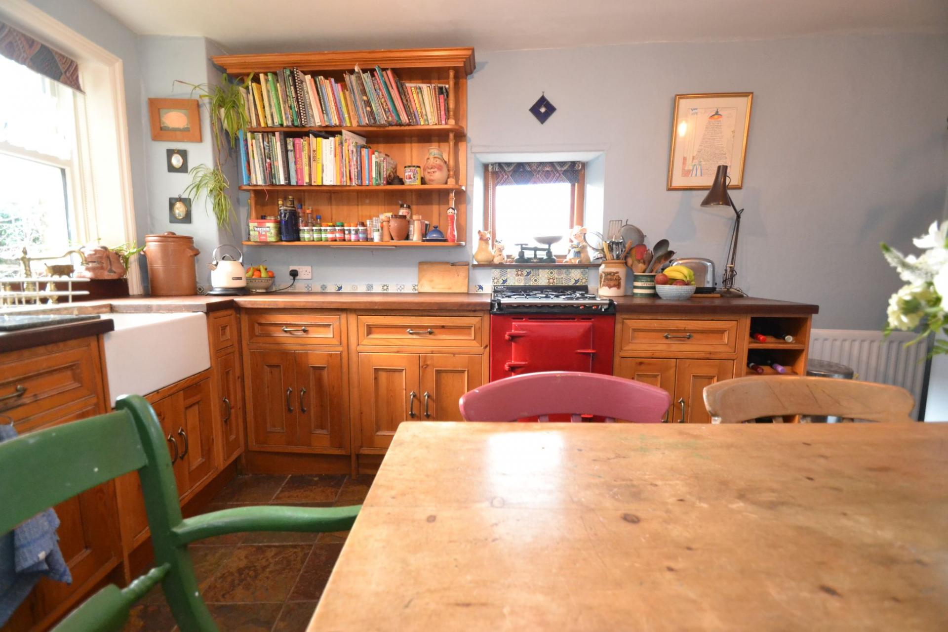 Kitchen Diner: 4.58m x 3.27m (15'0 x 10'7). Range of bespoke hand built wall & base units, wood work tops with tiling above, space for a dishwasher if required (not plumbed), space for an auto-washer, Belfast sink with a mixer brass tap, piped for a gas and electric oven, space for a tall boy fridge freezer, two wood dg windows, double radiator, Welsh slate tiled floor, space for a large table and chairs, pantry cupboard.