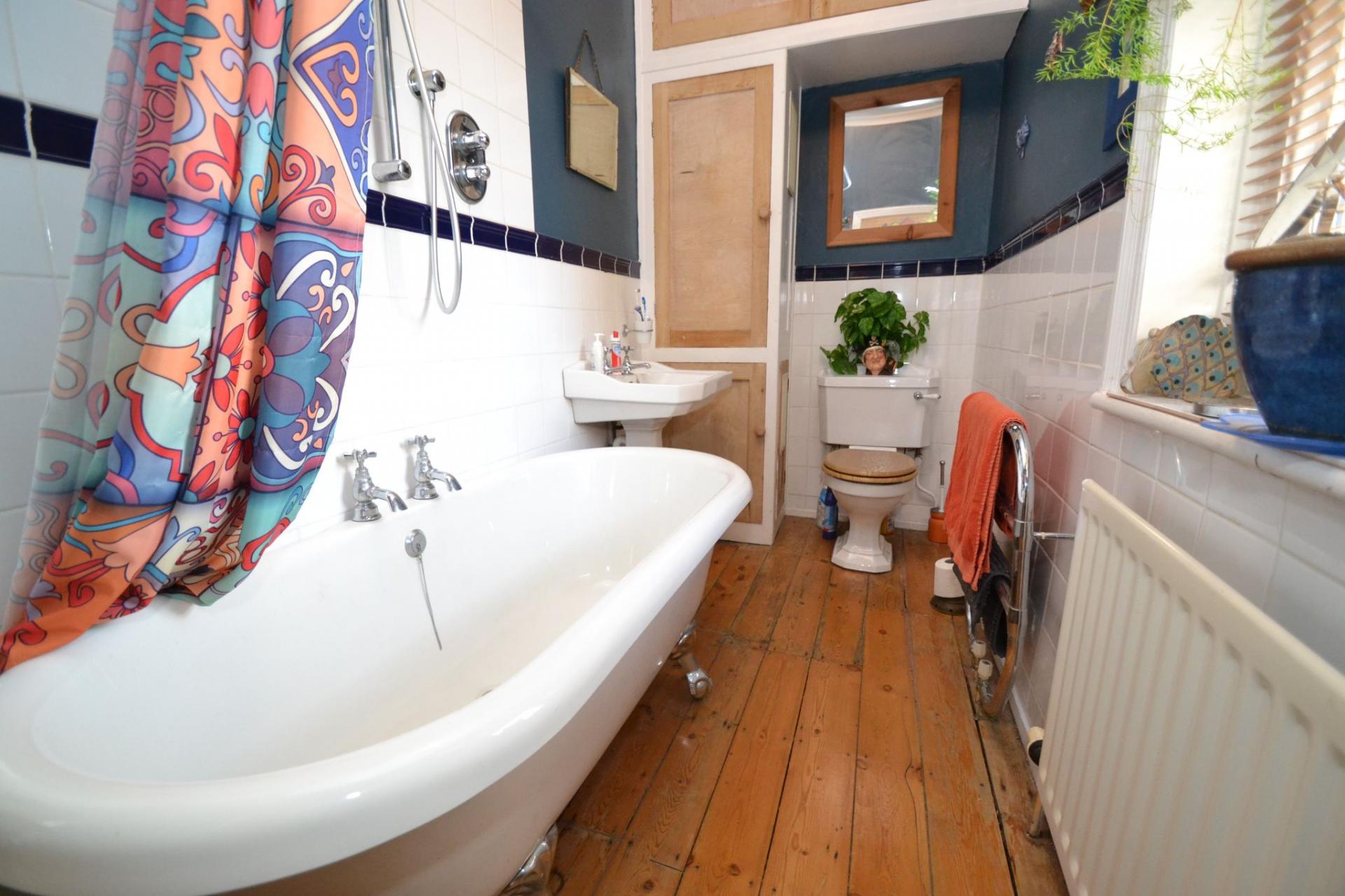 Bathroom: 3.51m x 1.45m (11'5 x 4'7). Free standing bath, shower rail and curtain with a chrome thermostatically controlled shower unit, wash basin and wc in white, heated chrome towel rail, radiator, sash wood dg window, part tiled, extractor, built in cupboard storage houses the Ideal Logic Max condensing combi-boiler.