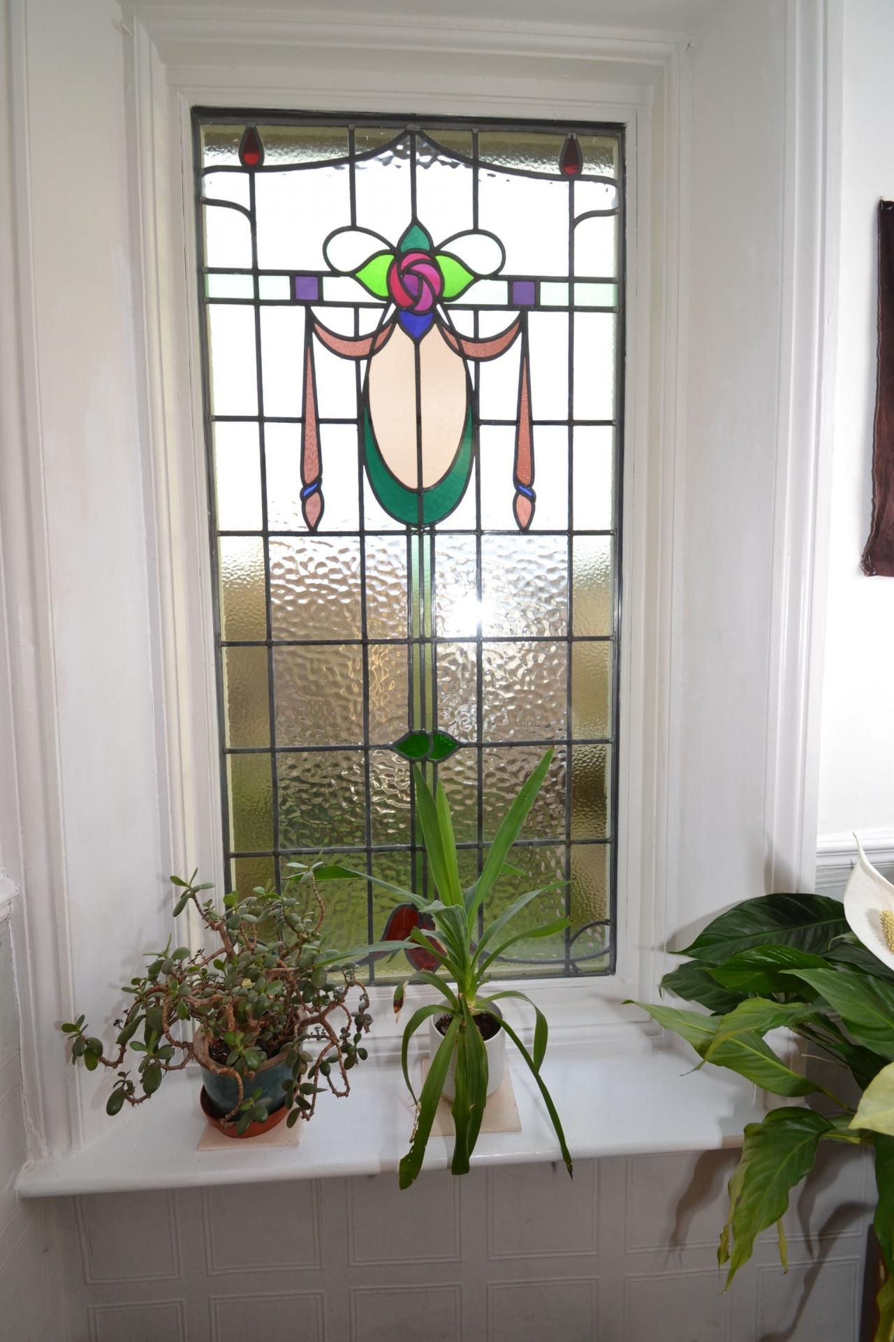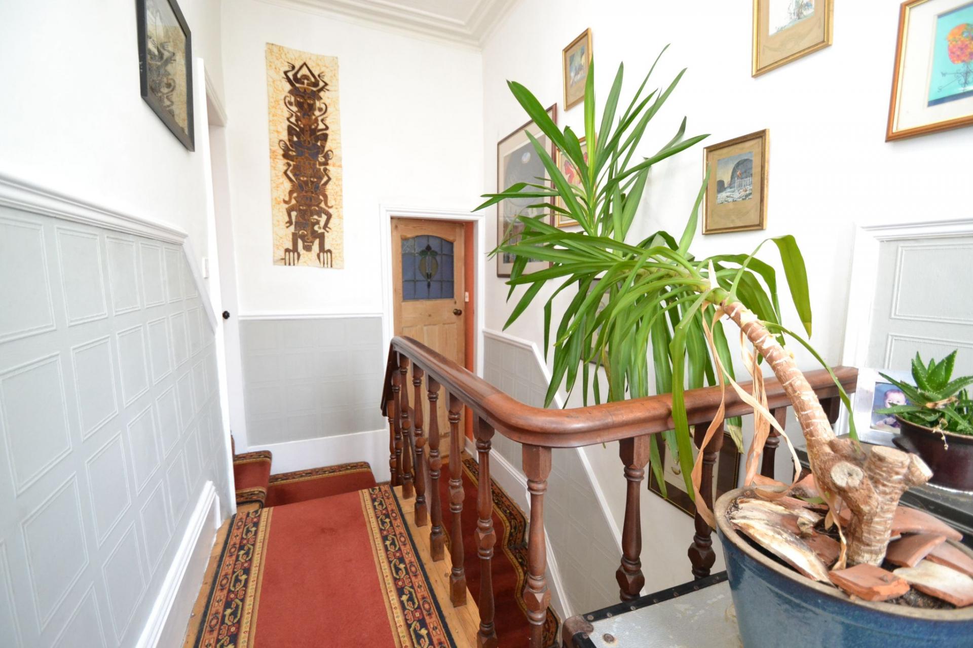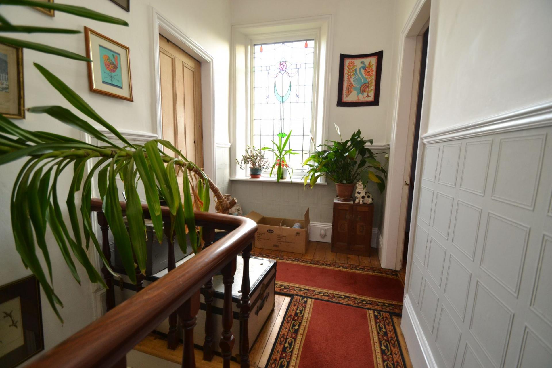 Landing & Stairs: Spacious landing with a feature coloured leaded window, part lincrusta decoration, cornice.