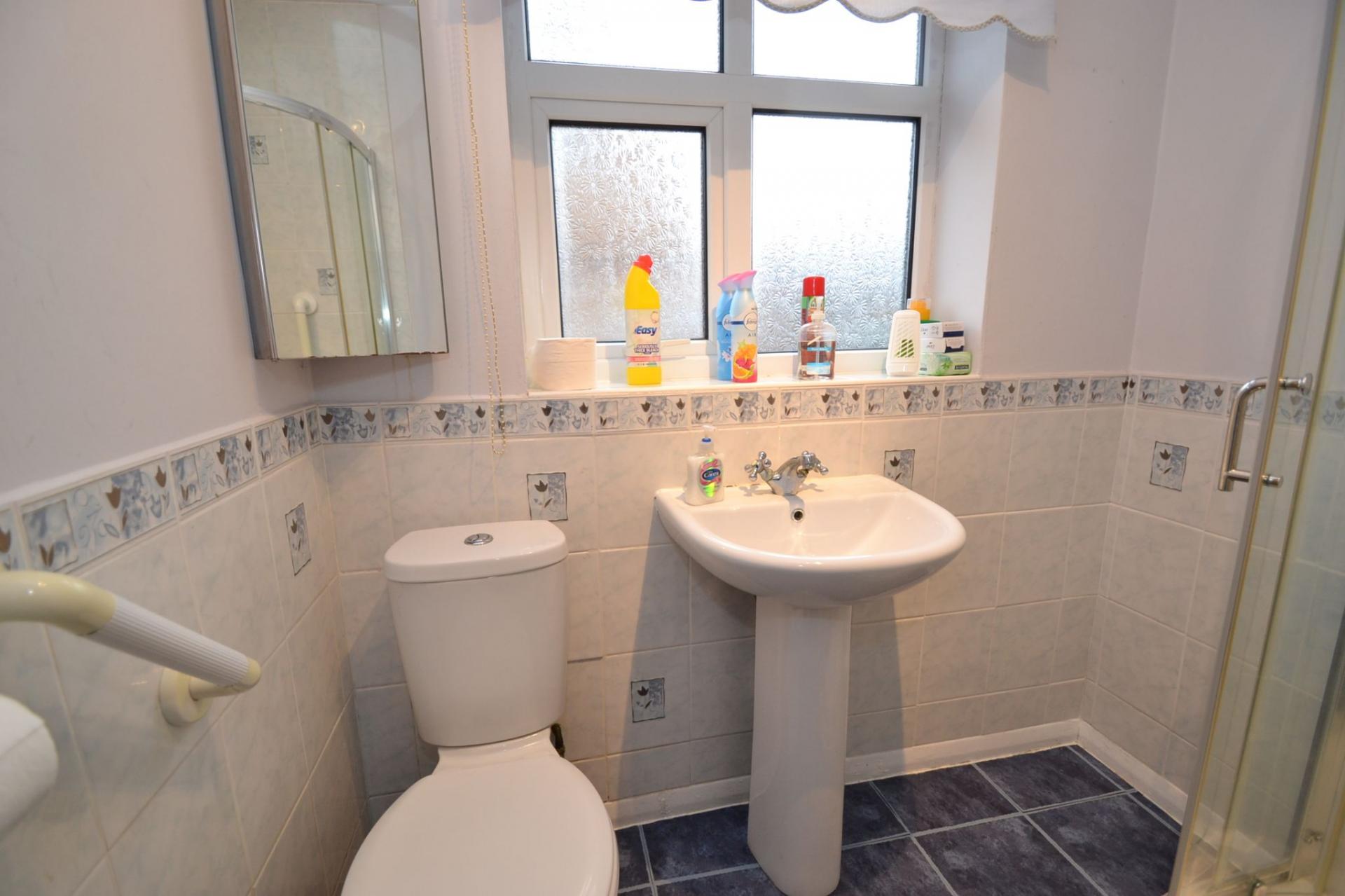 Shower Room: Wrap around shower cubicle with an electric shower unit, wash basin and wc in white, part tiled, heated chrome towel rail, frosted Upvc dg window.