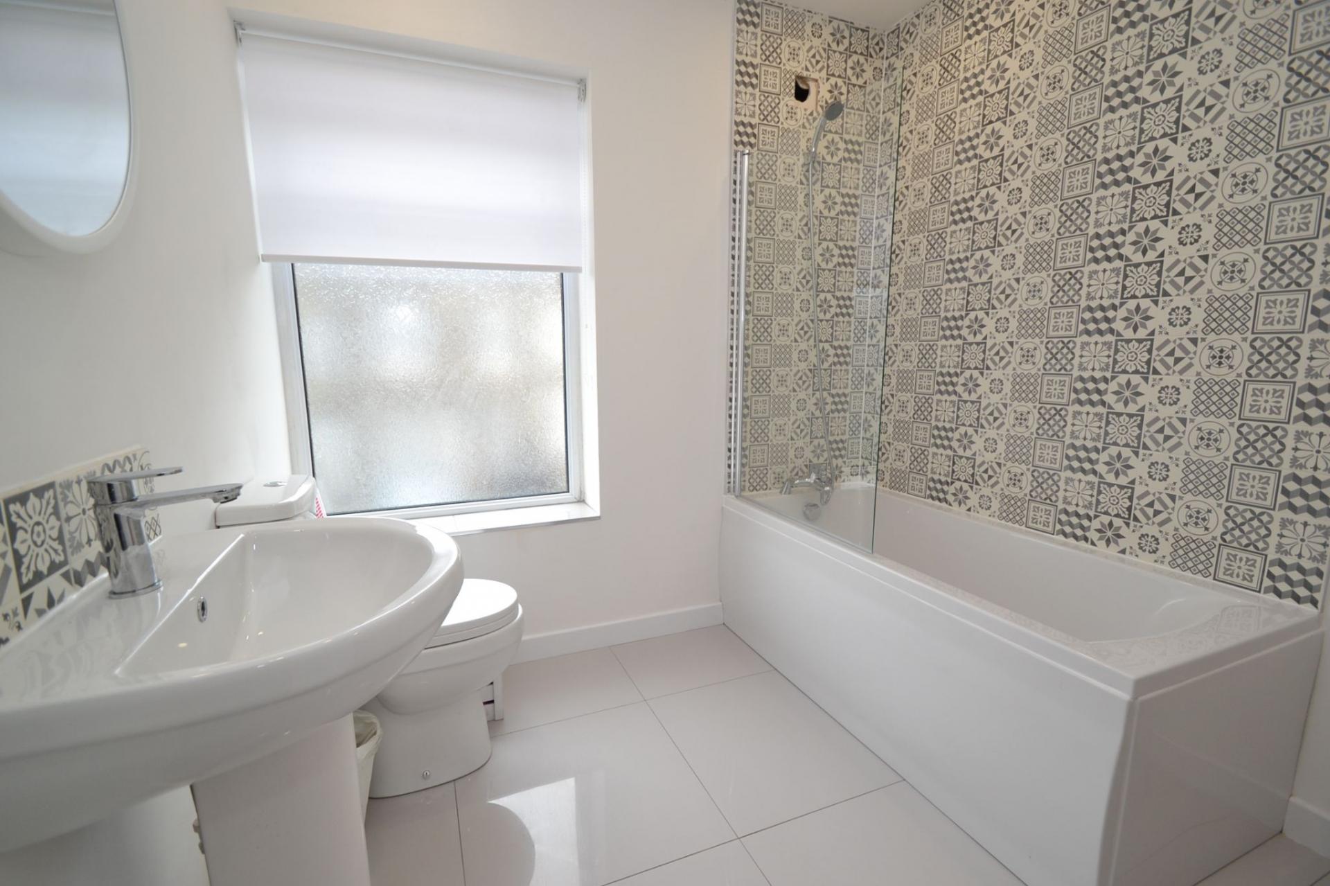Bathroom: 2.45m x 2.24m (8'0 x 7'4). Three piece suite in white, chrome fittings, part tiled, shower screen with shower mixer tap, extractor, Upvc dg frosted rear window, inset ceiling lights, heated chrome towel rail, polished tiled floor.