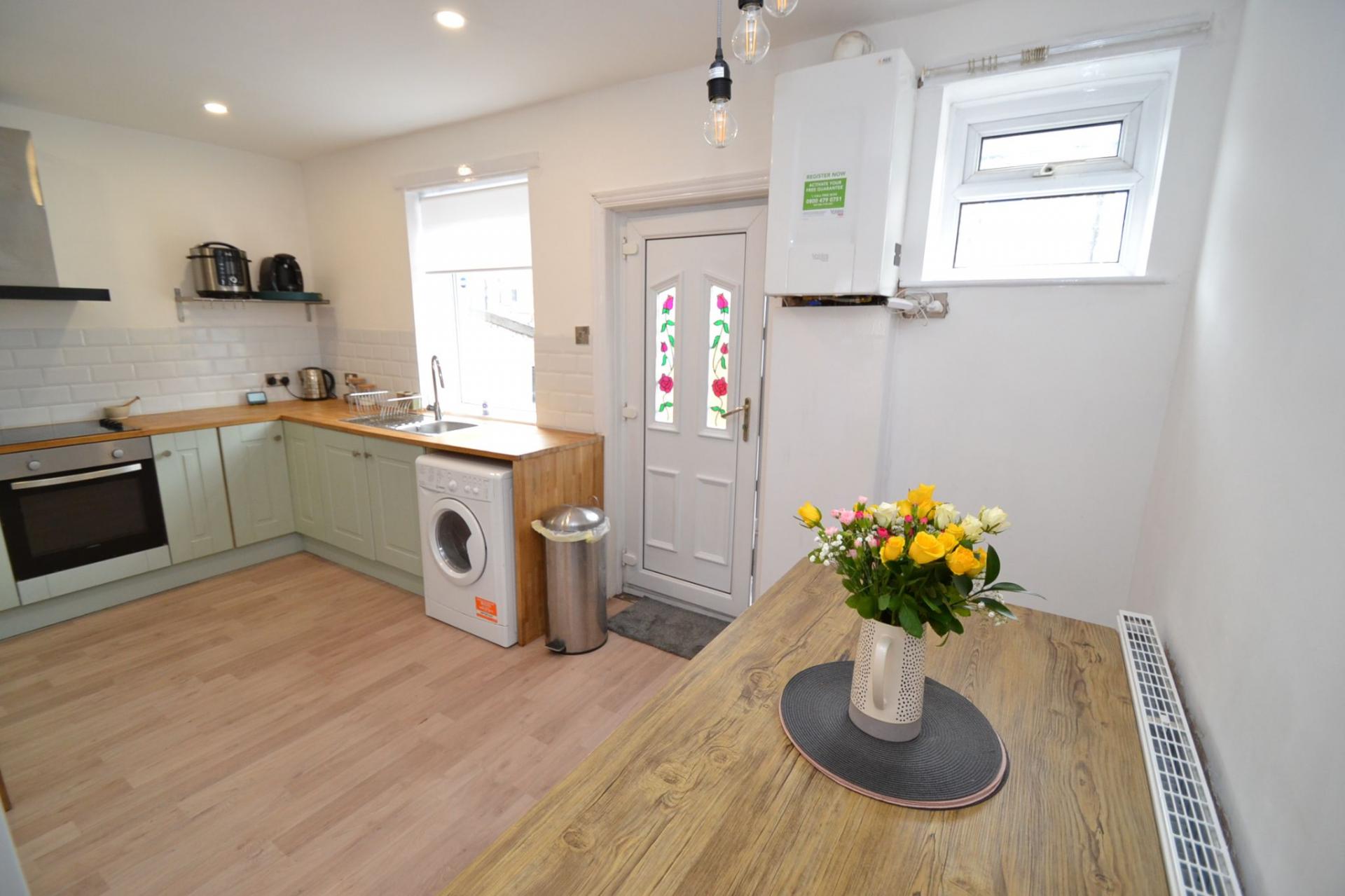 Kitchen Dining Room: 4.85m x 2.80m (15'10 x 9'2). Newly installed range of wall & base units in shaker style with solid butcher work tops and white brick effect tiling above, stainless steel extractor and light over a 4 ring halogen hob, built in electric stainless steel oven, plumbed for an auto-washer, space for a fridge freezer, laminate floor, two Upvc dg windows to rear along with a Upvc door, space for a table and chairs, wall mounted Vokera condensing boiler, radiator, pantry cupboard under stairs.