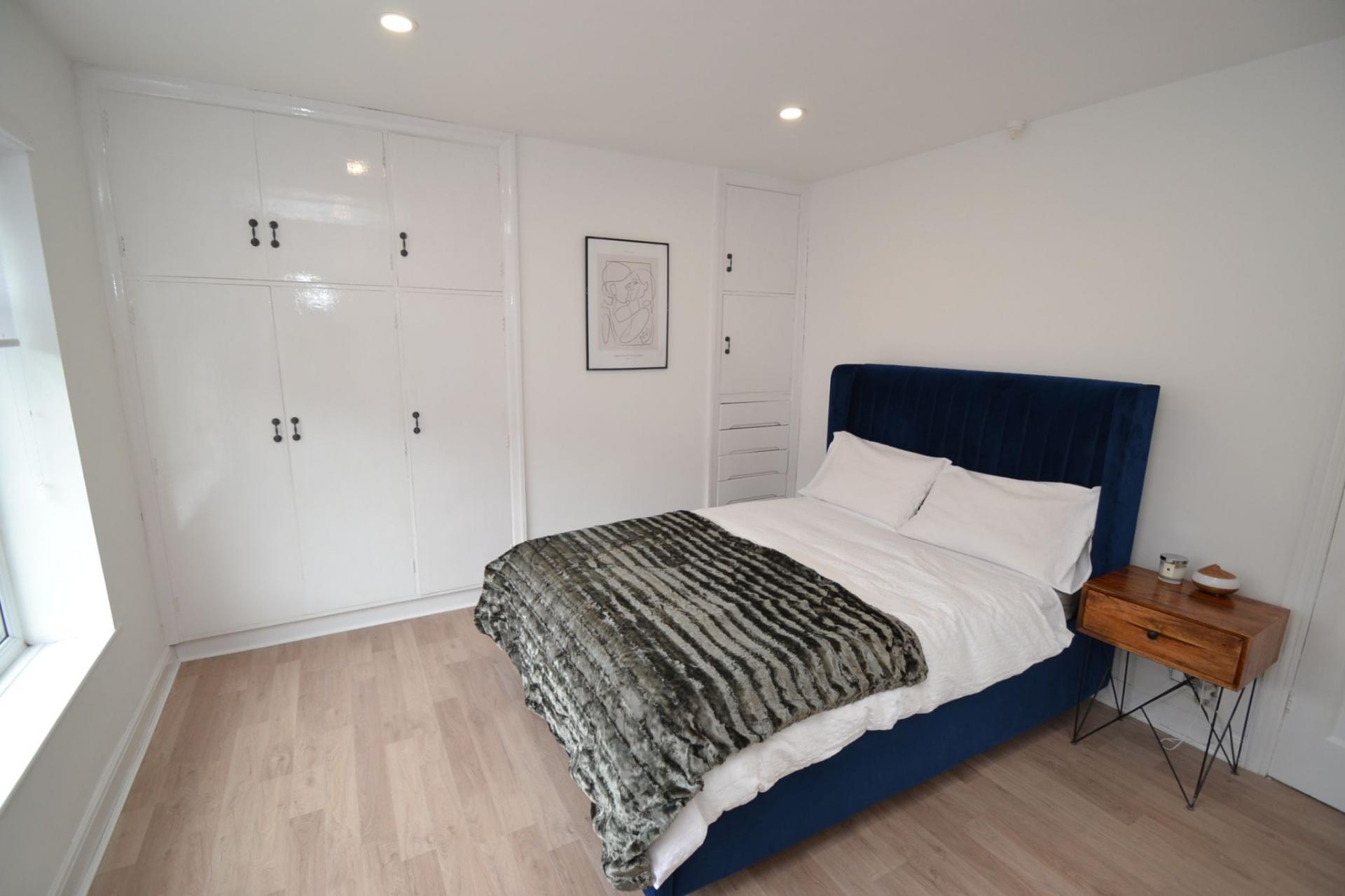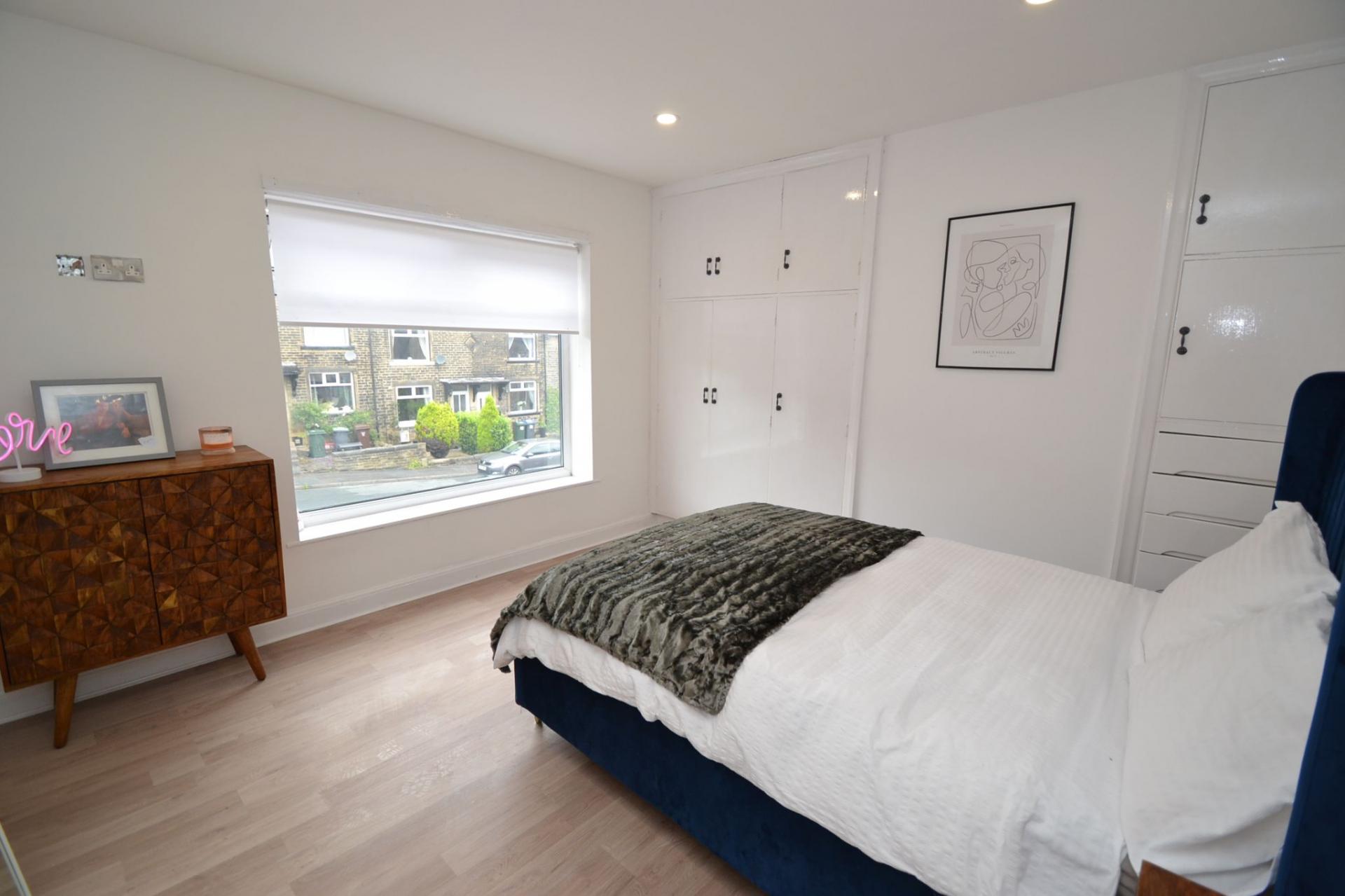 Bedroom 1: 3.53m x 3.52m (11'6 x 11'6). Upvc dg window to front with fitted roller blind, radiator, fitted robes and cupboard storage, laminate floor.
