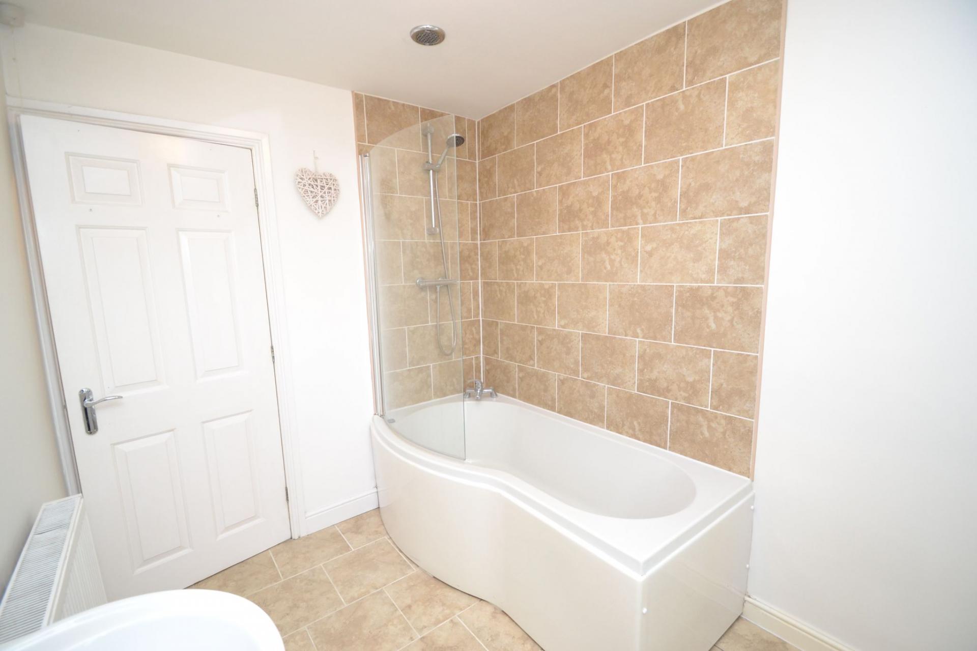 Bathroom: 2.73m x 2.10 m (8'9 x 6'8). Three piece P shaped suite in white, shower screen with a chrome thermostatically controlled shower unit over the bath, wash basin and wc, part tiled, radiator, frosted Upvc dg window.