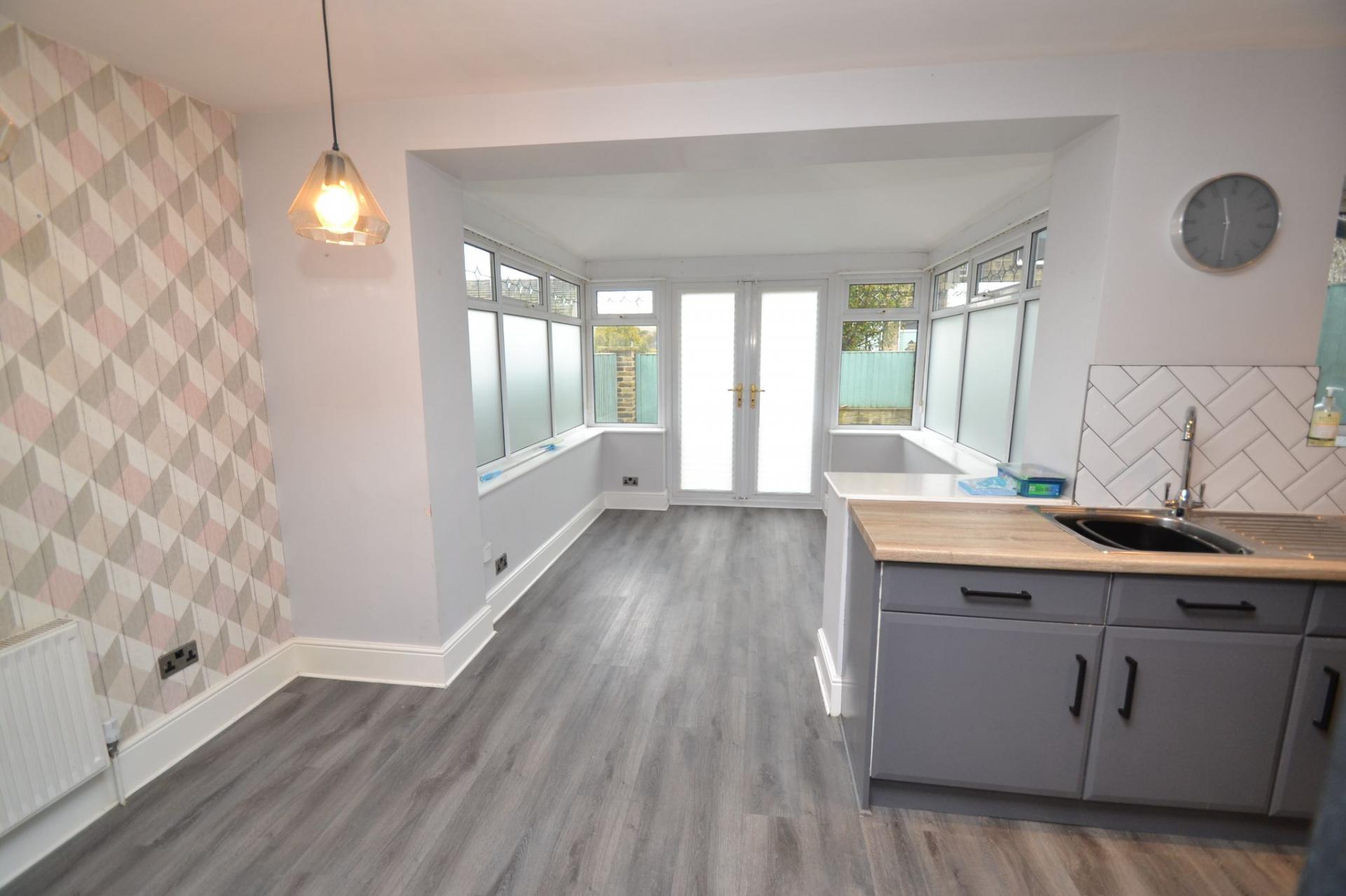 Rear Open plan Kitchen to conservatory: 6.04m x 4.74m (19'8 x 15'5). Range of wall & base units in grey, work tops with diamond tiling above, extractor and light over a 4 ring stainless steel gas hob, built in gas oven, plumbed for a dishwasher, integrated fridge and freezer, stainless steel sink, inset ceiling lights, Upvc dg window, laminate floor, radiator, space for a table and chairs. The conservatory has power, radiator, Upvc dg French doors.