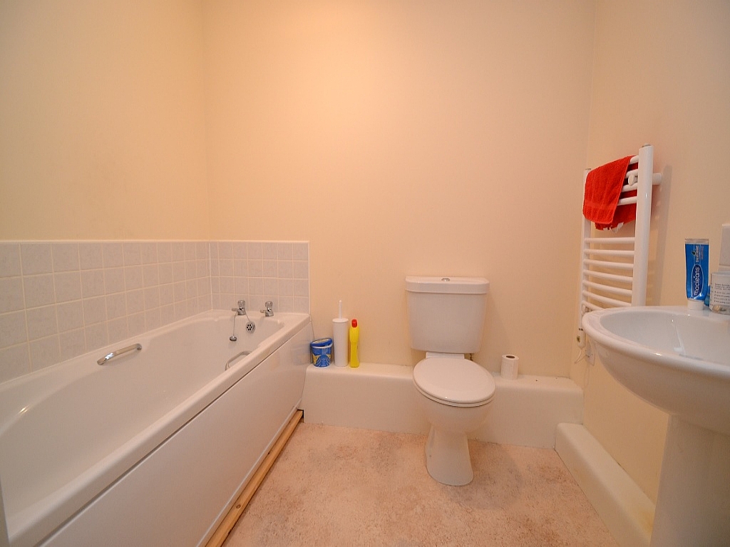 Bathroom: Three piece suite in white, part tiled, electric heated towel rail, extractor.