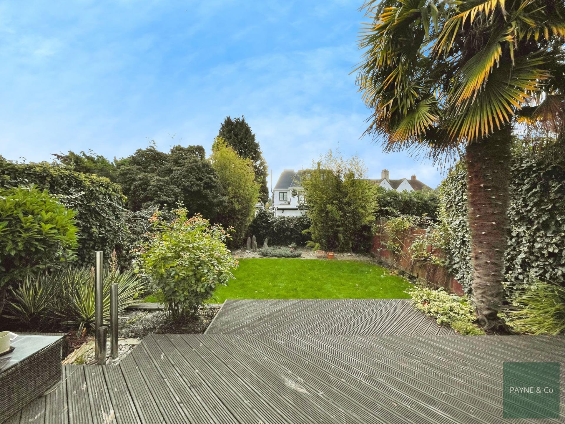 - 48ft southeast-facing rear garden with decked area, lawn, and electric awning
