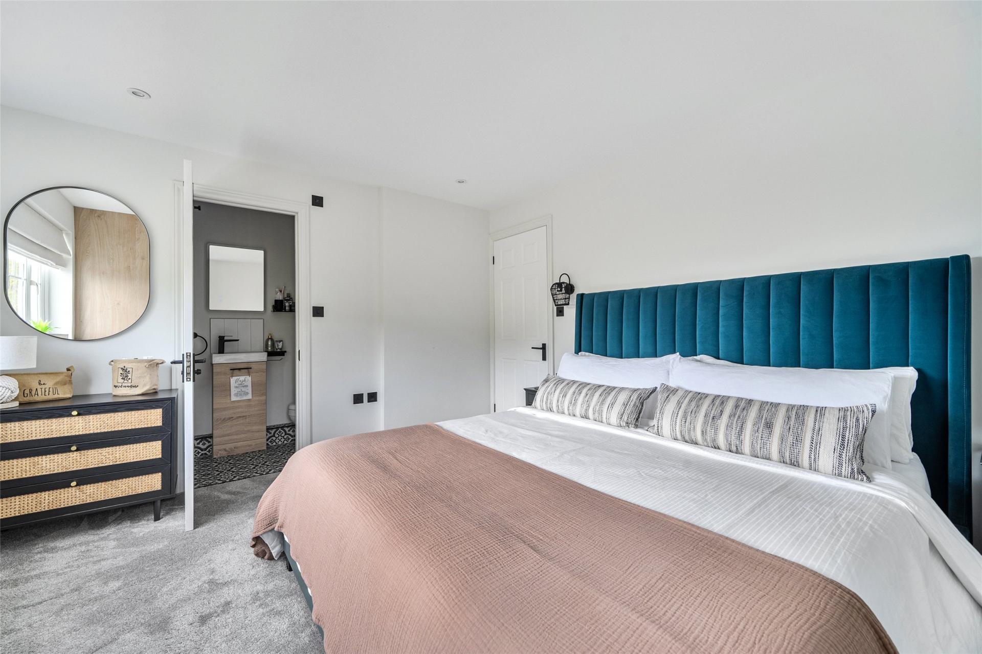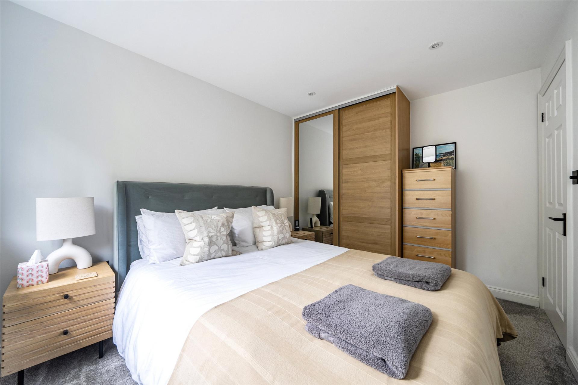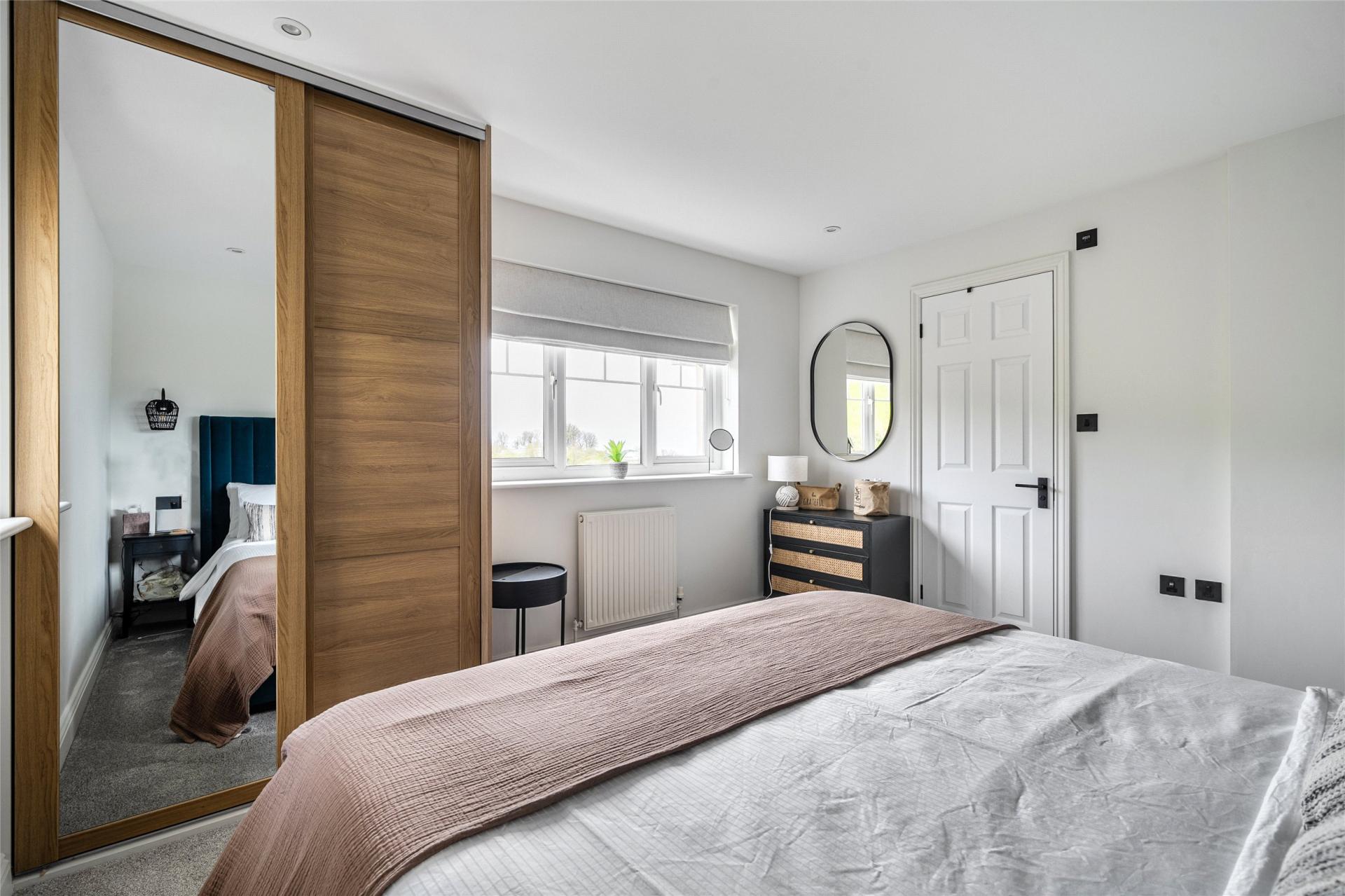 On the second floor, there are three well-proportioned bedrooms and a beautifully appointed family bathroom. The principal bedroom is particularly impressive, offering space for a super king-size bed, fitted wardrobes, superb views, and the added benefit of a modern en-suite shower room. The second bedroom is another generous double with fitted storage, while the third bedroom, currently arranged with bunk beds, would also make an excellent home office or study. The family bathroom is finished to a high standard, featuring contemporary fittings.