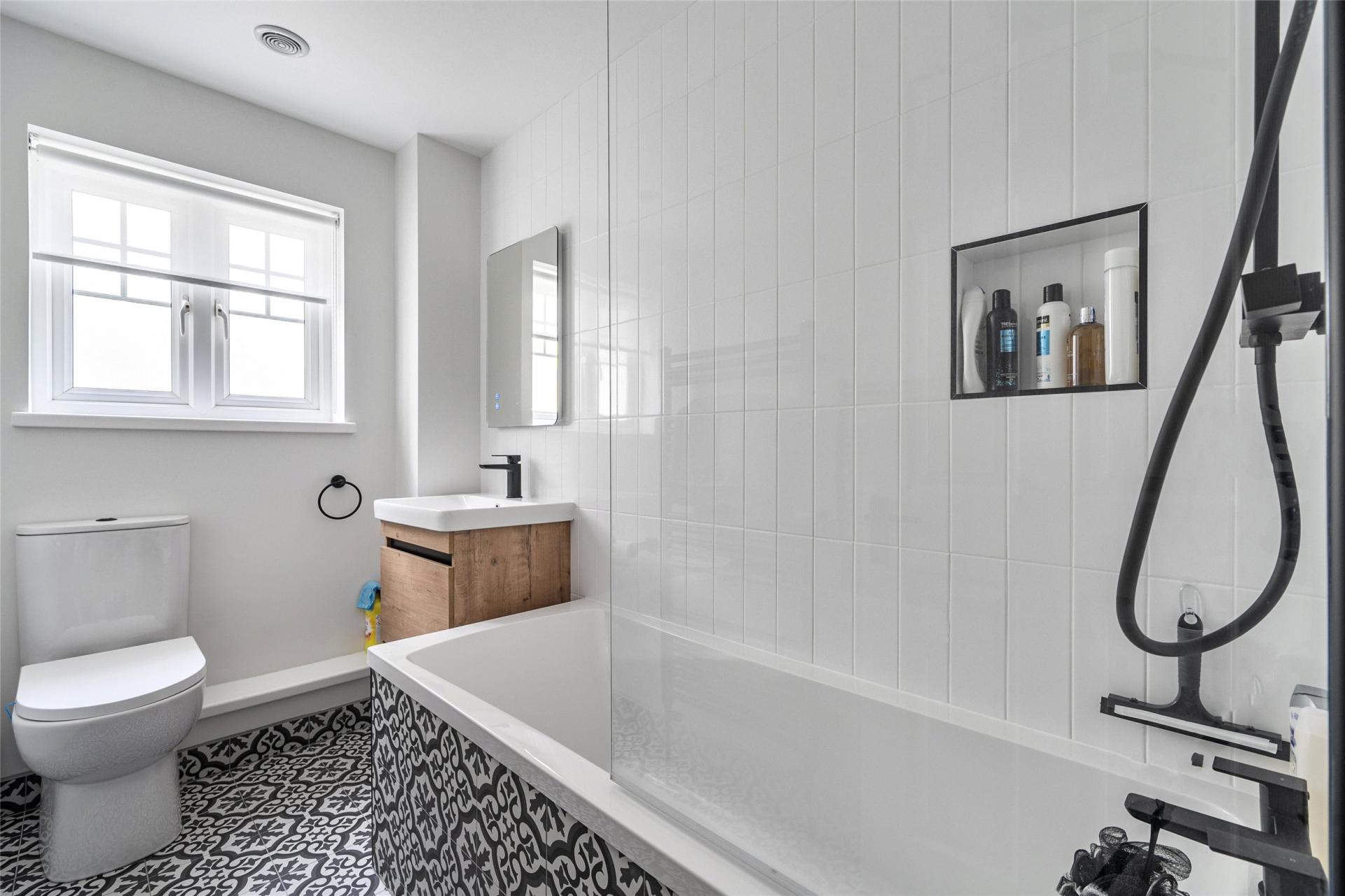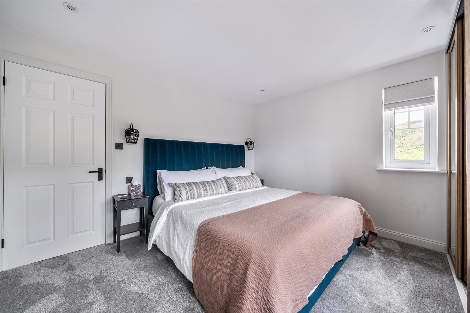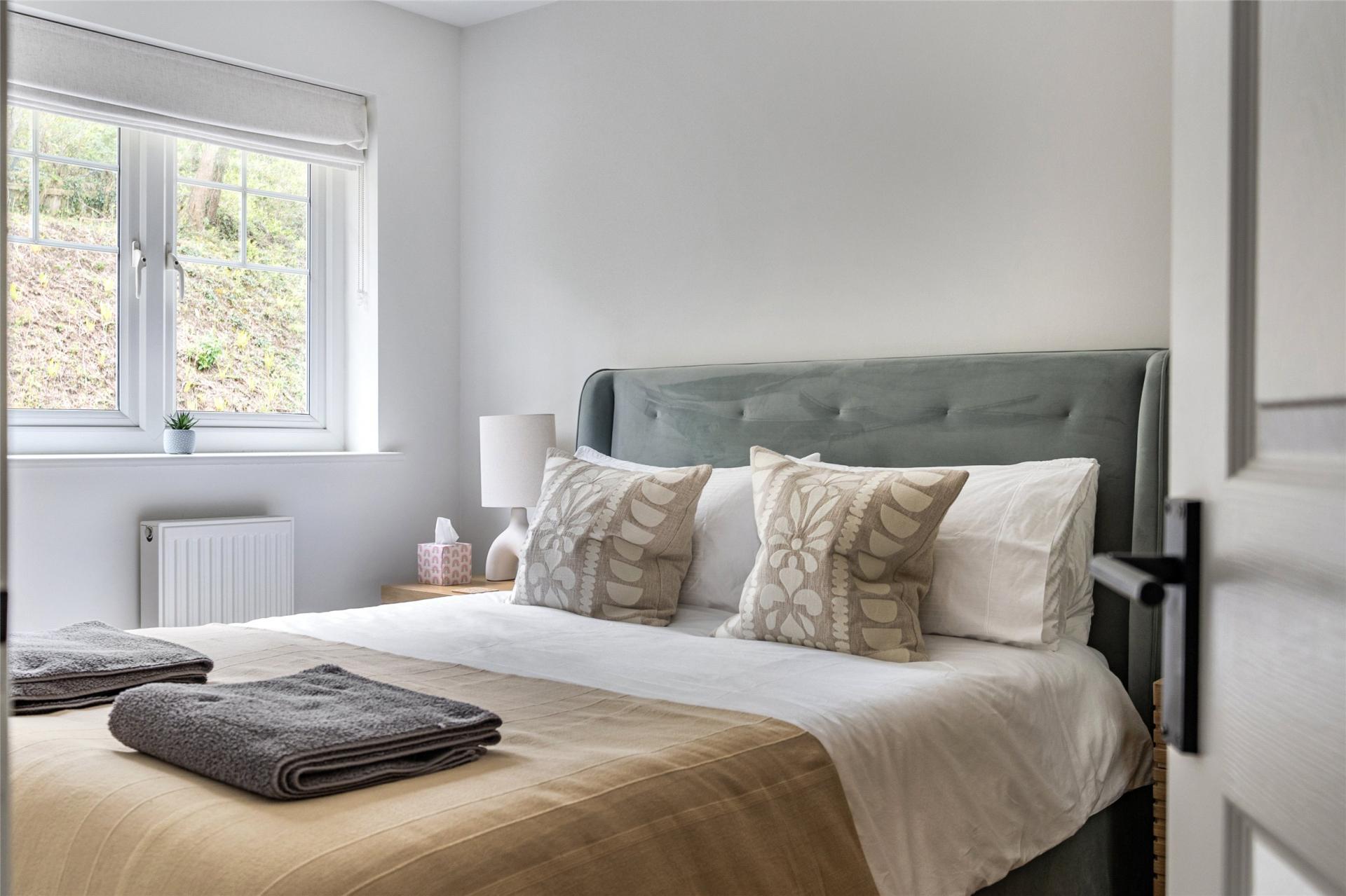 On the second floor, there are three well-proportioned bedrooms and a beautifully appointed family bathroom. The principal bedroom is particularly impressive, offering space for a super king-size bed, fitted wardrobes, superb views, and the added benefit of a modern en-suite shower room. The second bedroom is another generous double with fitted storage, while the third bedroom, currently arranged with bunk beds, would also make an excellent home office or study. The family bathroom is finished to a high standard, featuring contemporary fittings.