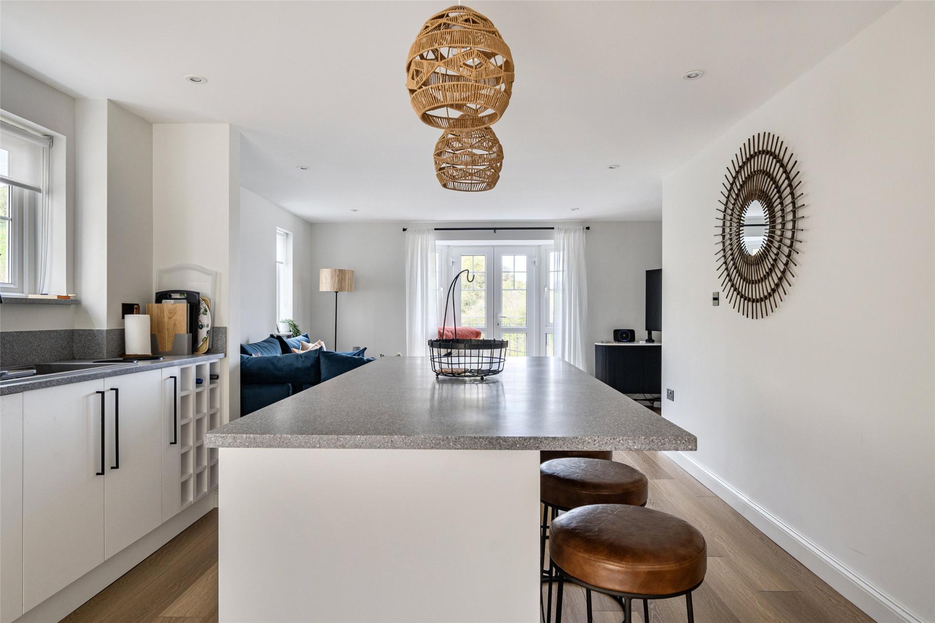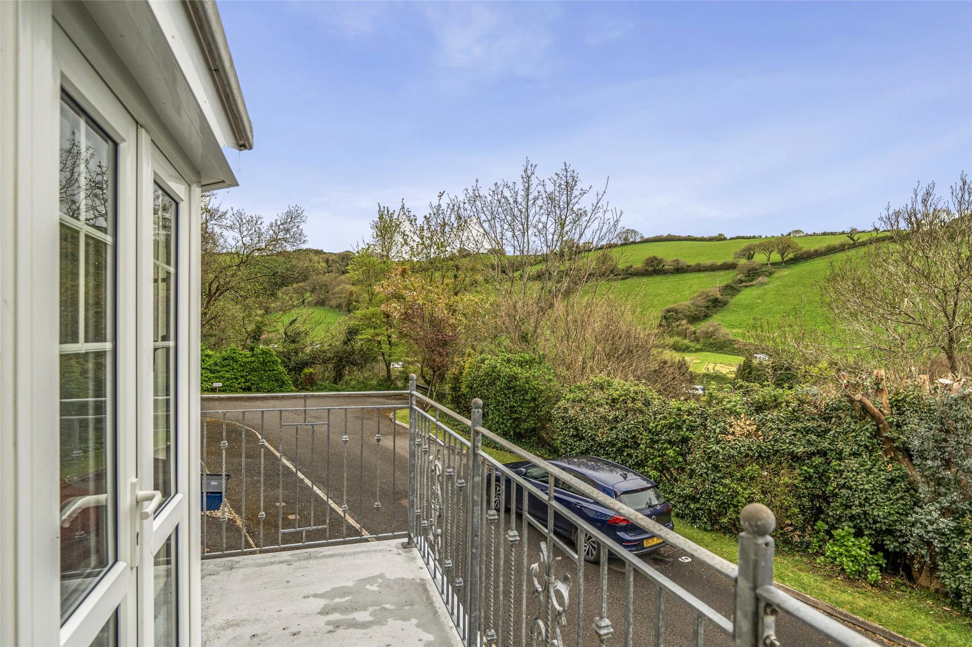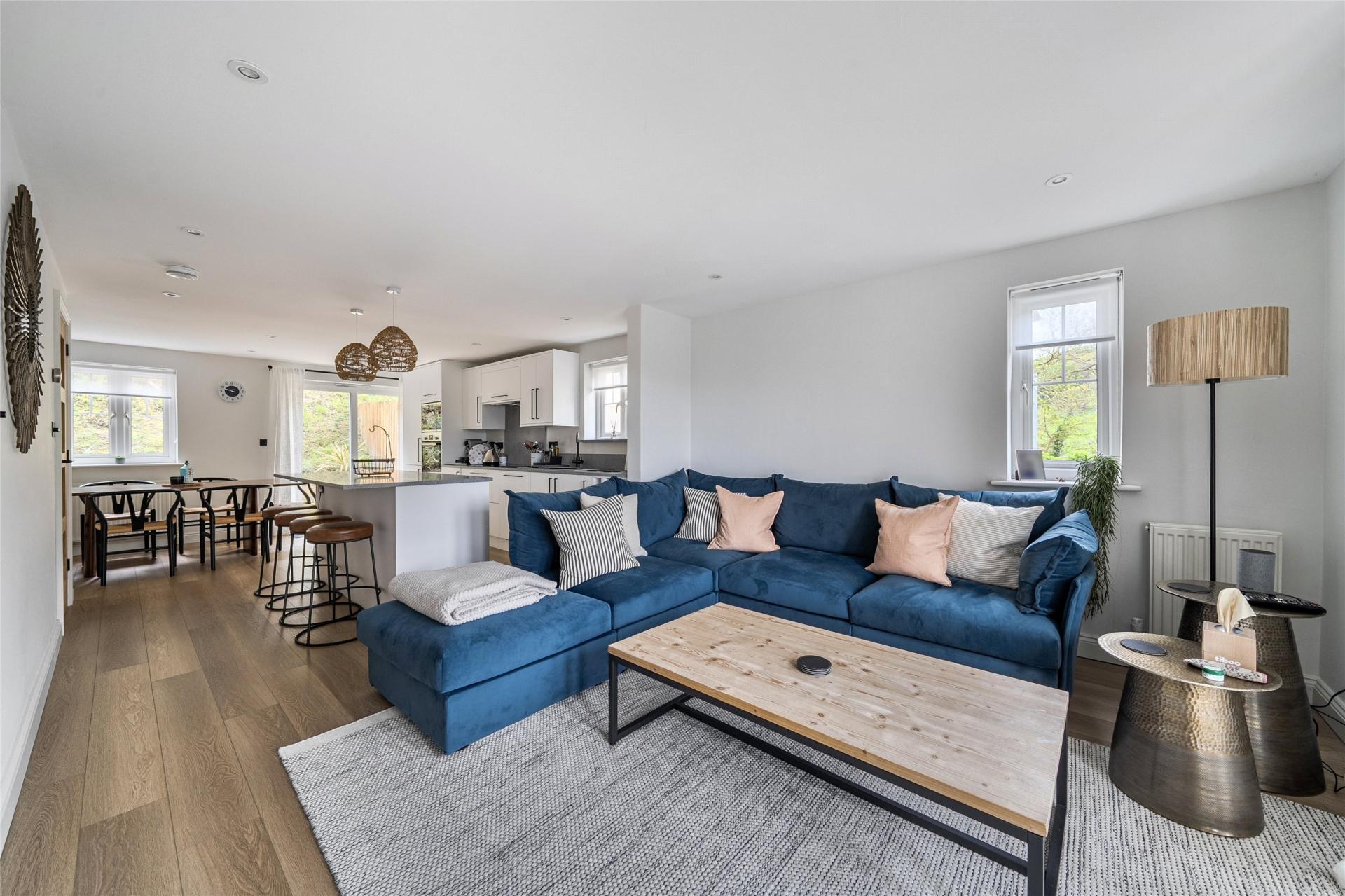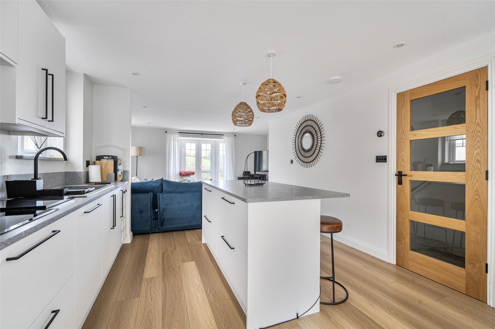 The accommodation is thoughtfully arranged to provide well-balanced and flexible living space, ideal for both family life and entertaining. The first floor forms the heart of the home, featuring an impressive open-plan kitchen, dining and living area. The stylish kitchen is fitted with a comprehensive range of high-quality units and integrated appliances, while the generous lounge area comfortably accommodates substantial furnishings. From here, doors open onto a spacious balcony—an ideal vantage point from which to enjoy the stunning sea and countryside views. To the rear, the dining area provides direct access to a low-maintenance garden, perfect for outdoor dining and relaxation.